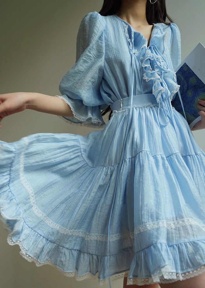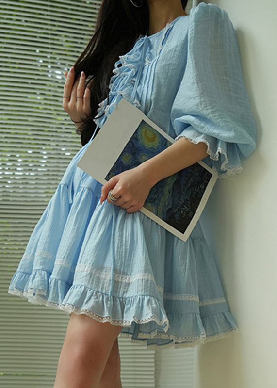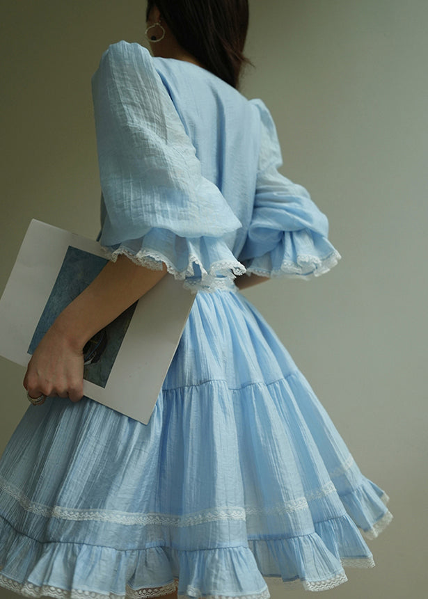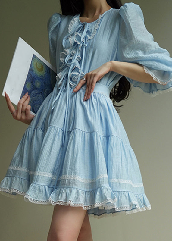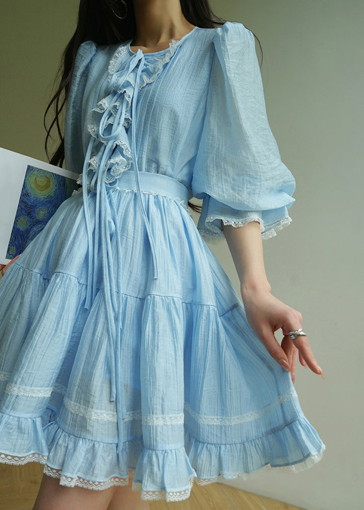 Boho Blue O-Neck Lace Patchwork Silk Cotton Top And Skirts Two Pieces Set Summer