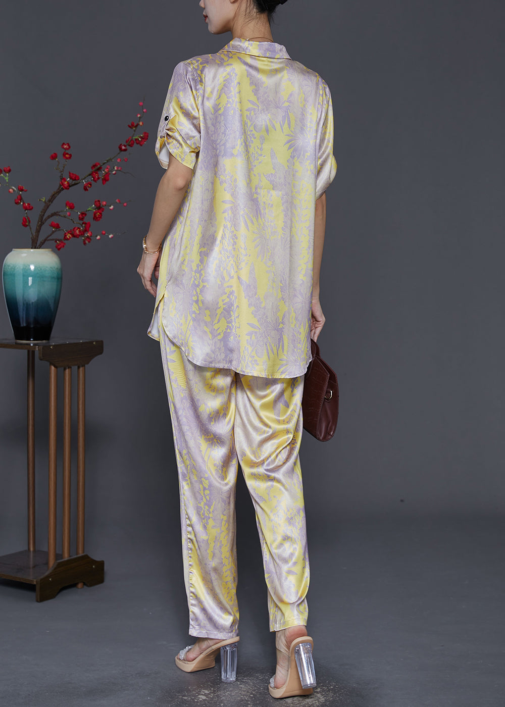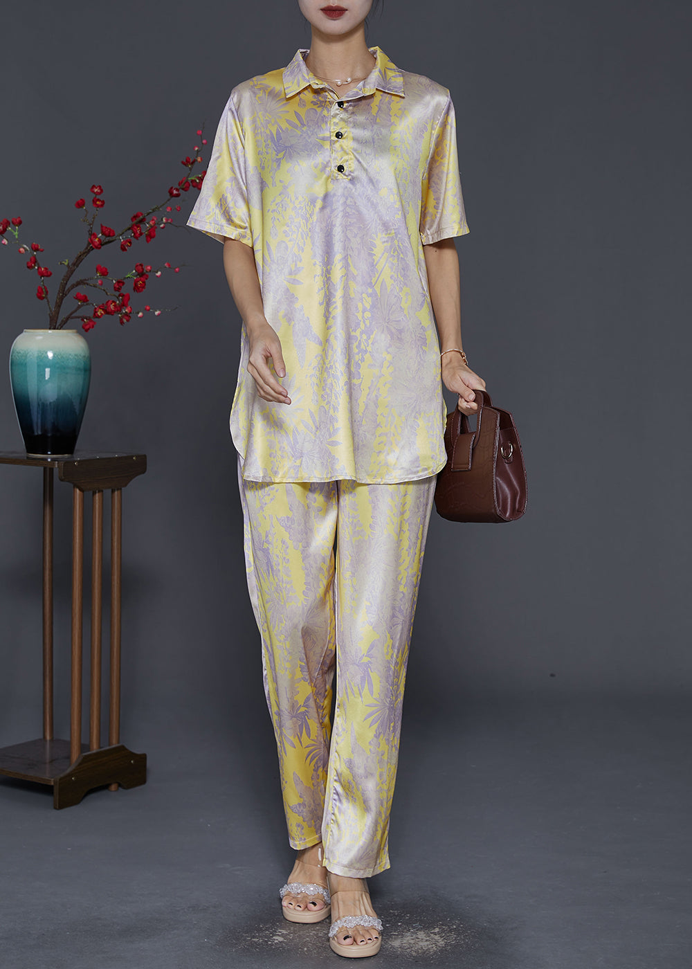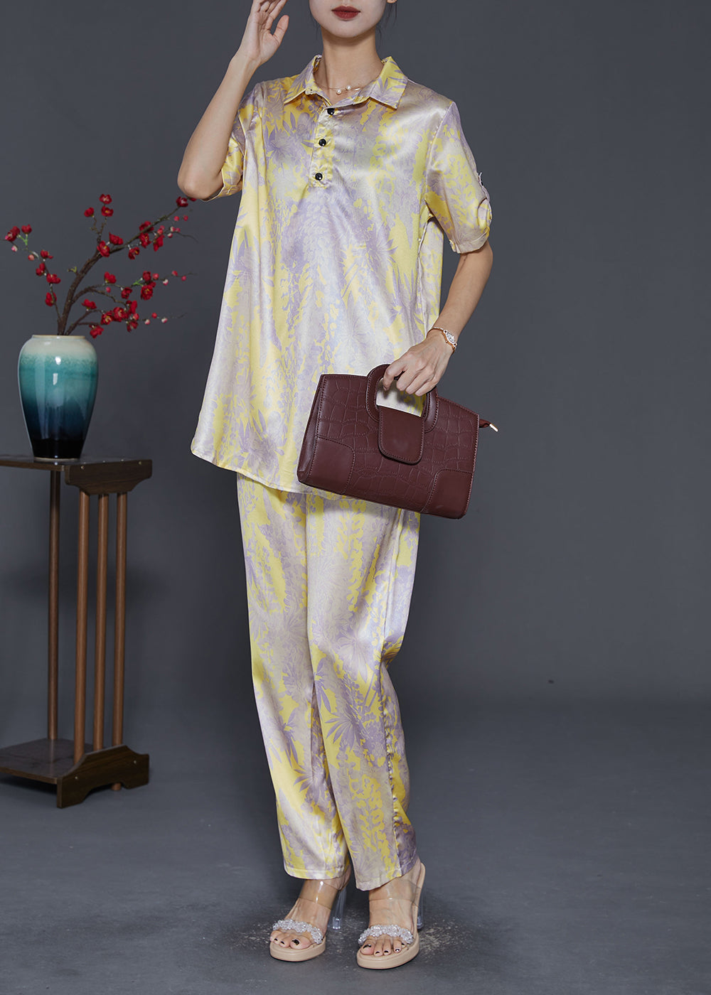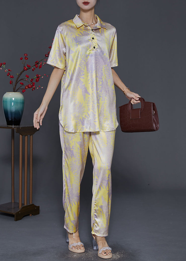 Boho Yellow Peter Pan Collar Print Silk Two-Piece Set Fall