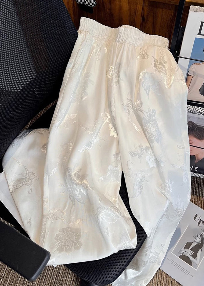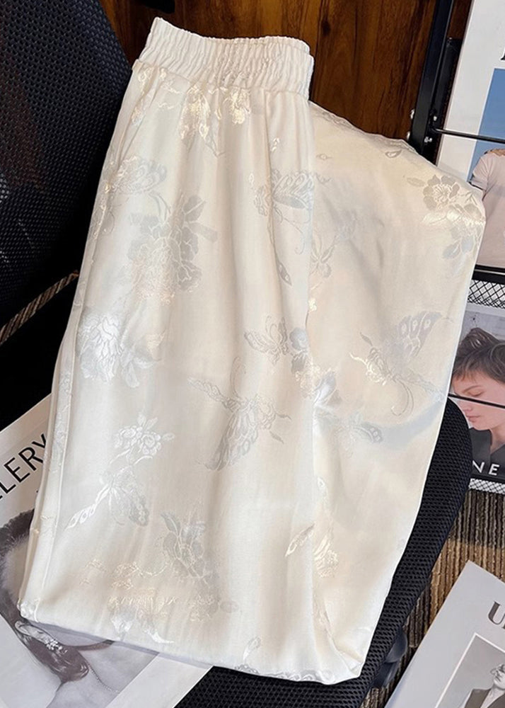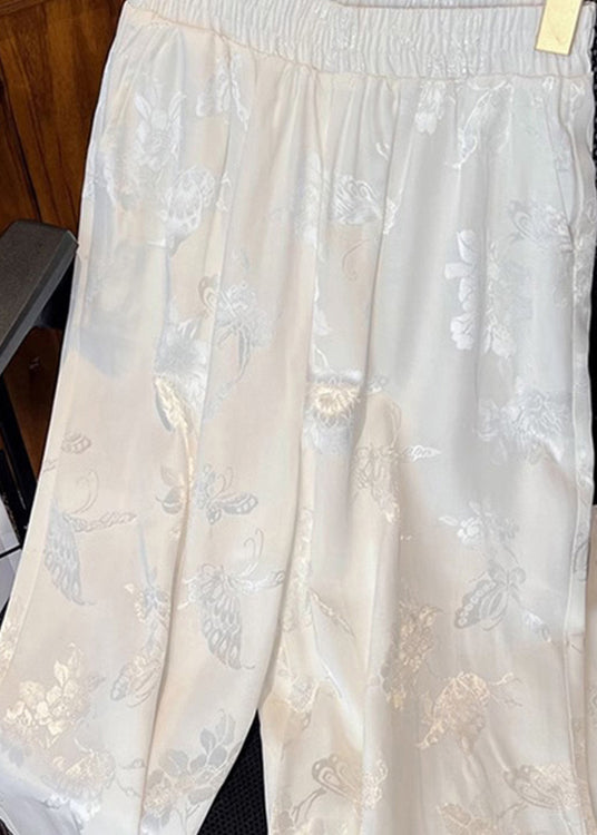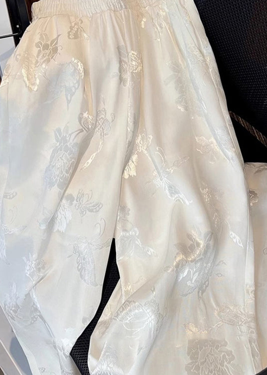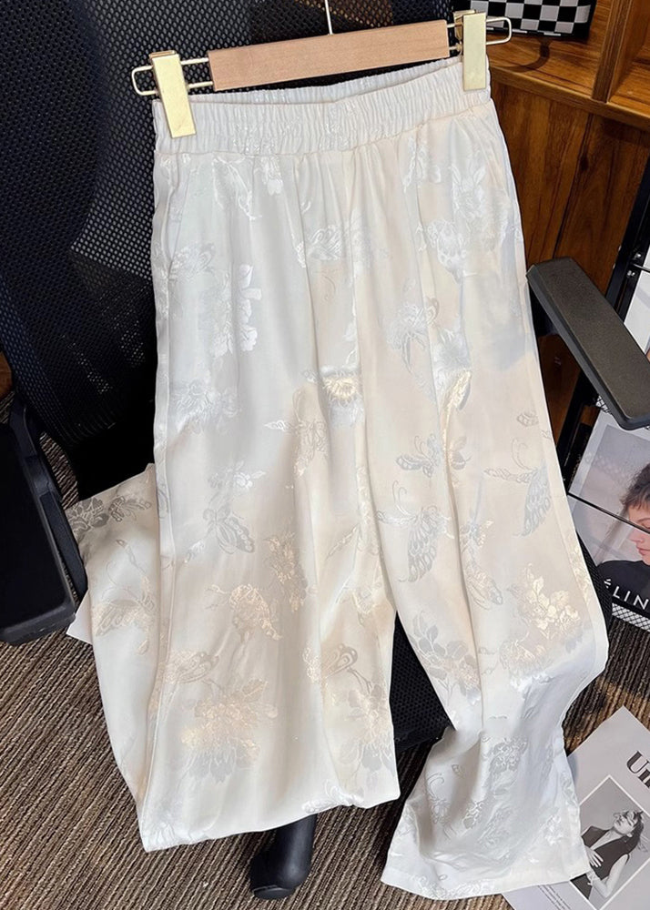 Boutique White Elastic Waist Jacquard Patchwork Silk Wide Leg Pants Summer