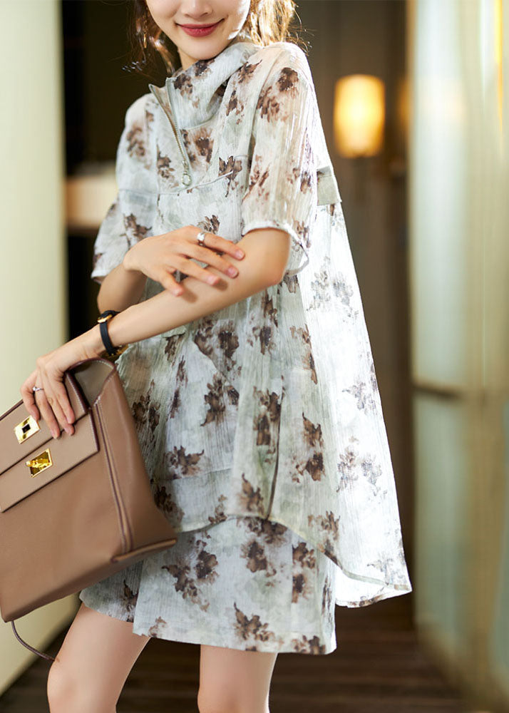 Brief Blue Grey Print Silk Hooded Shorts Top And Two Pieces Set Summer