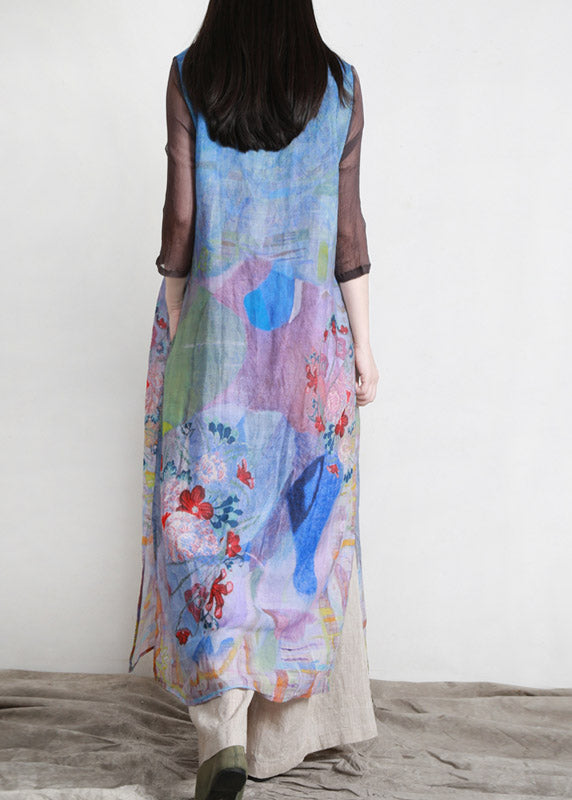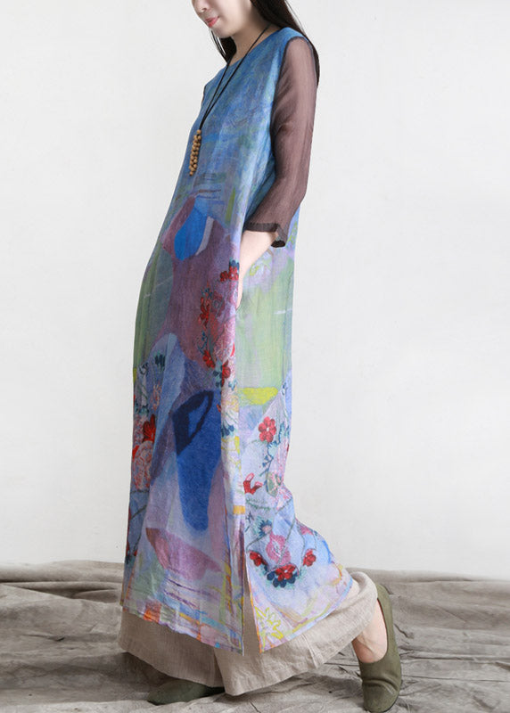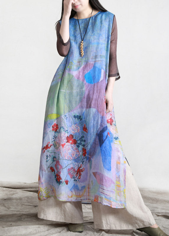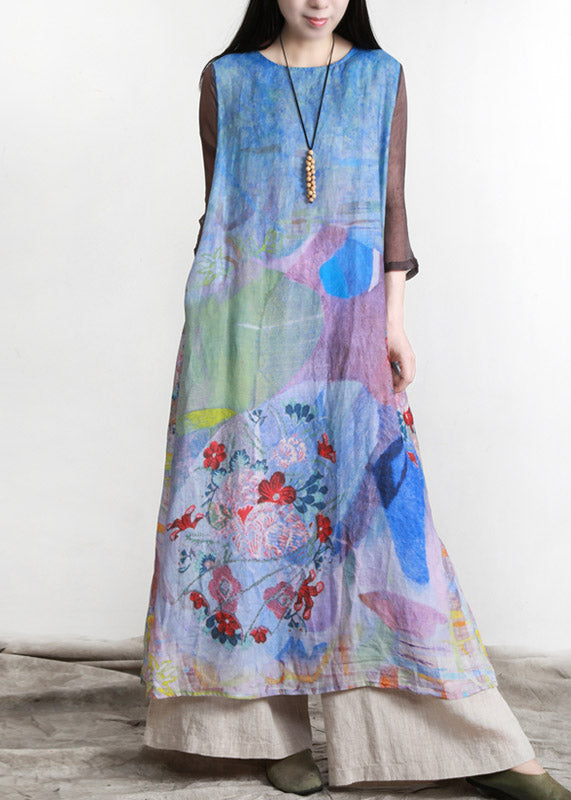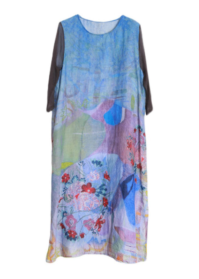 Brief Blue Print Pockets Side Open Silk Patchwork Linen Dress Three Quarter Sleeve