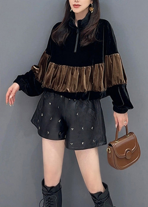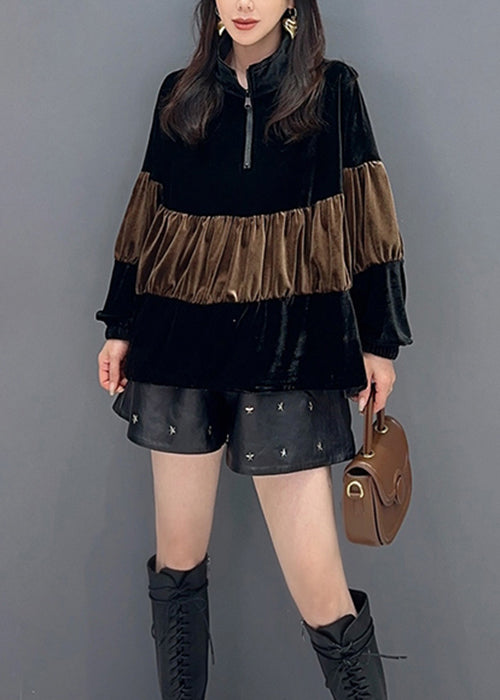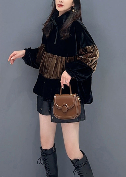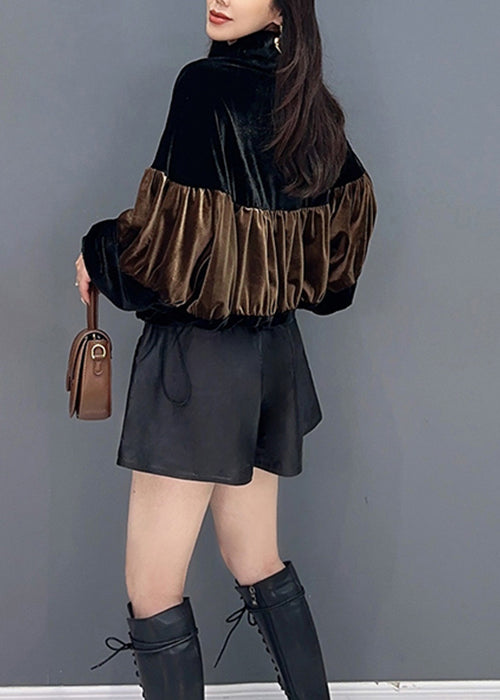 Brown Drawstring Patchwork Silk Velour Top Stand Collar Long Sleeve