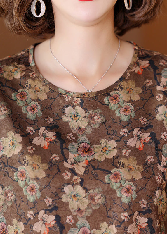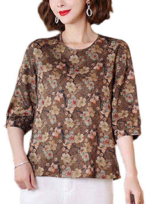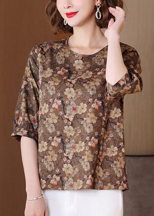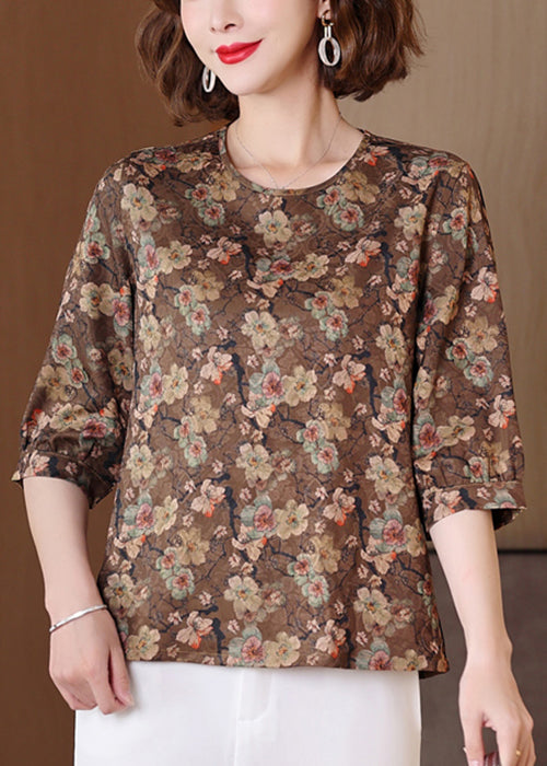 Chic Caramel O Neck Print Patchwork Silk Shirts Half Sleeve