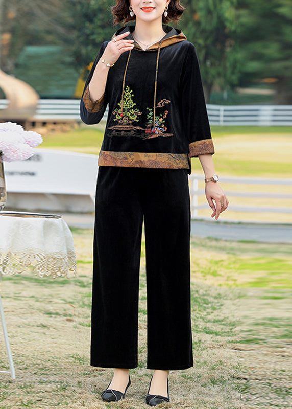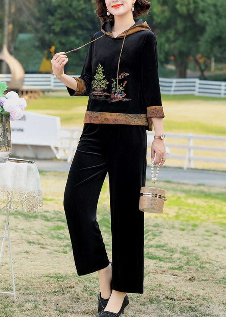 Chic Wine Red Print Drawstring Hooded Silk Velour Top And Wide Leg Pants Two Pieces Set Fall