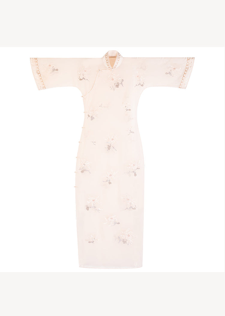 Chinese Style Beige Stand Collar Embroidered Patchwork Silk Dress Fall