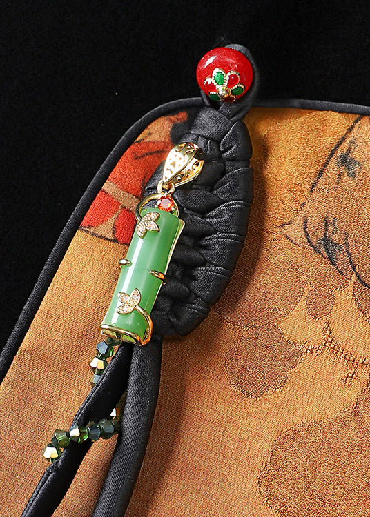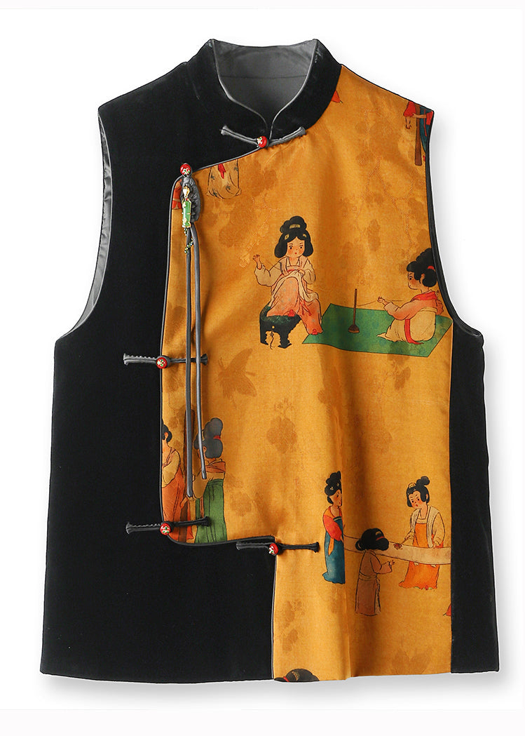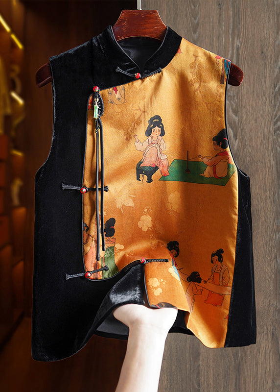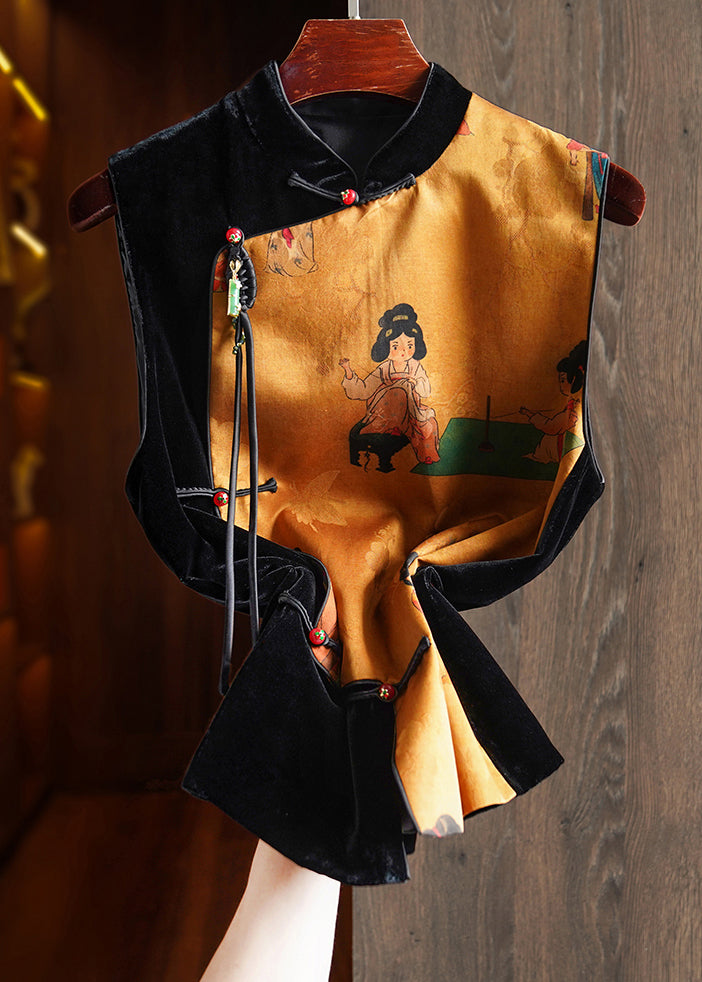 Chinese Style Black Tasseled Print Patchwork Silk Velour Vest Sleeveless