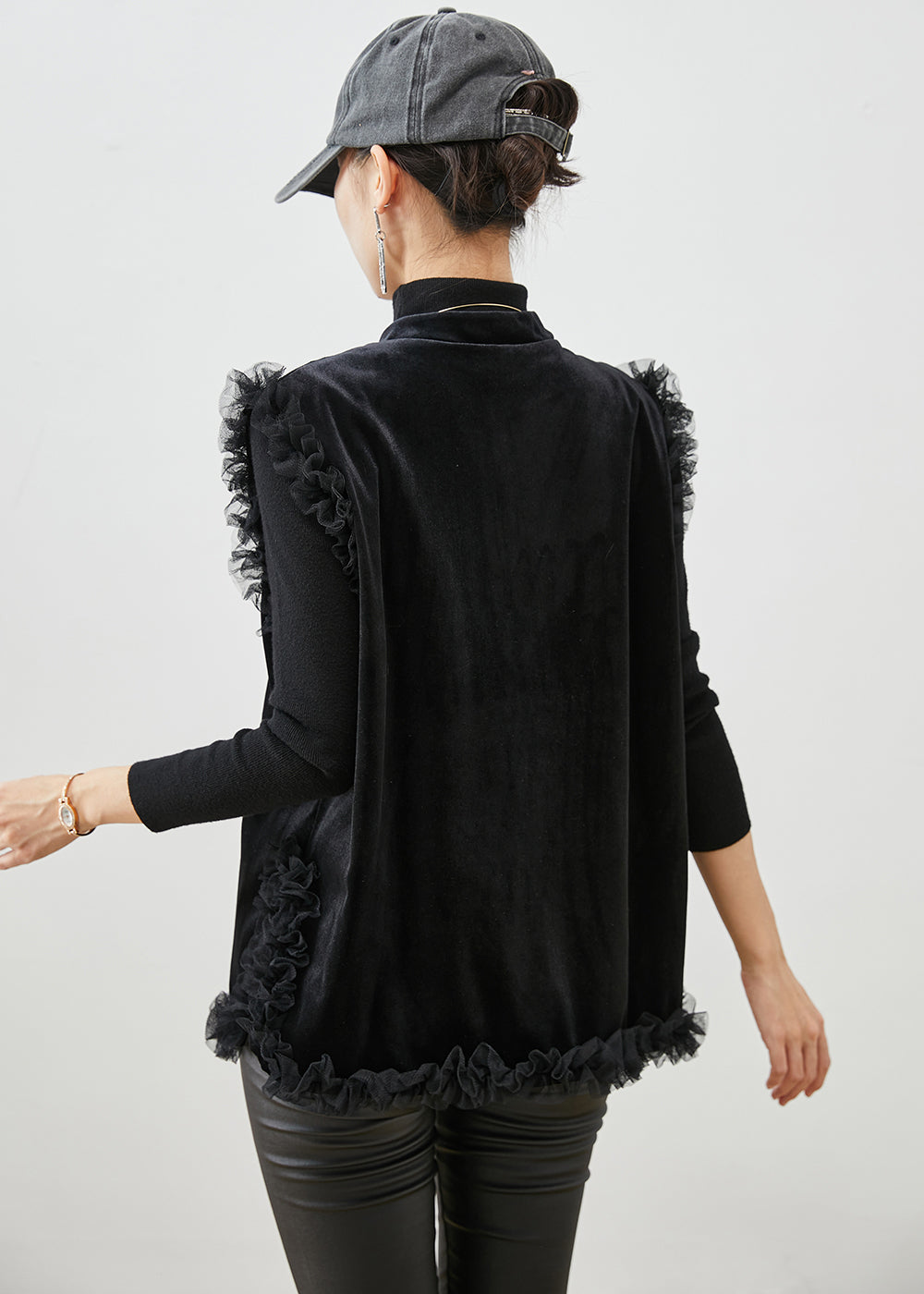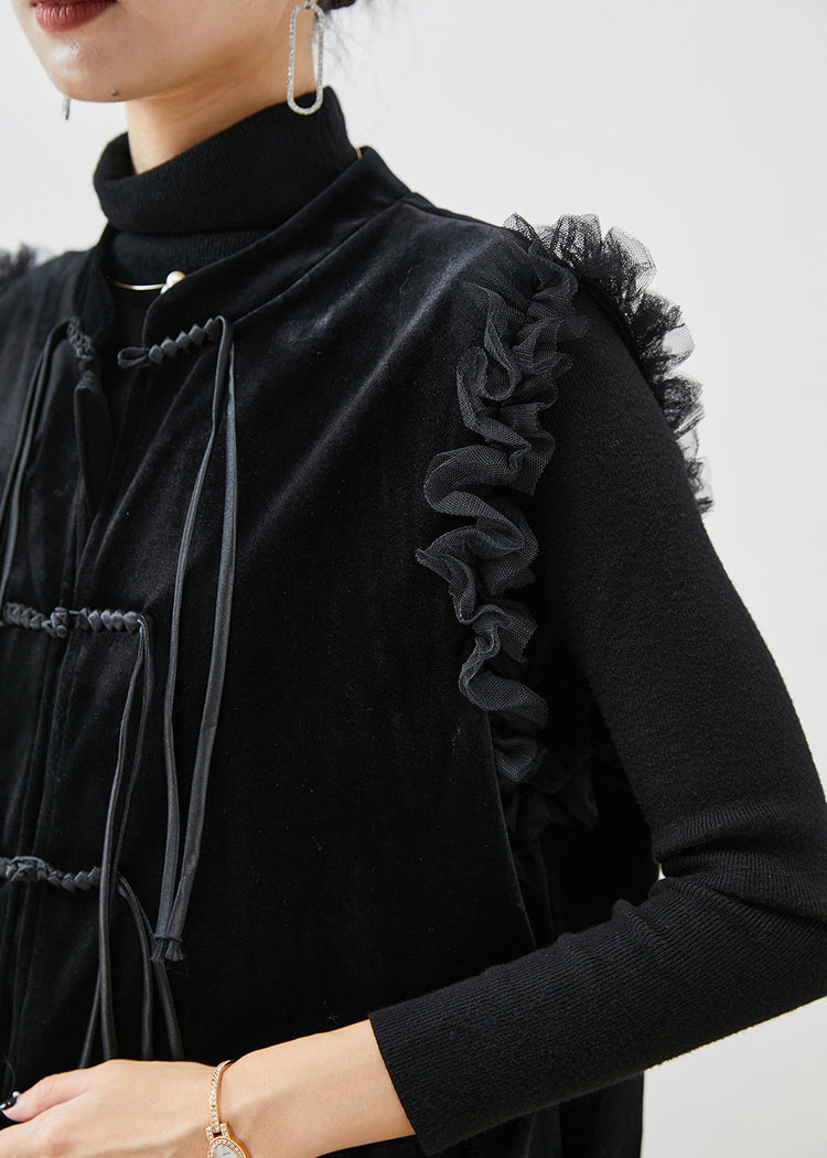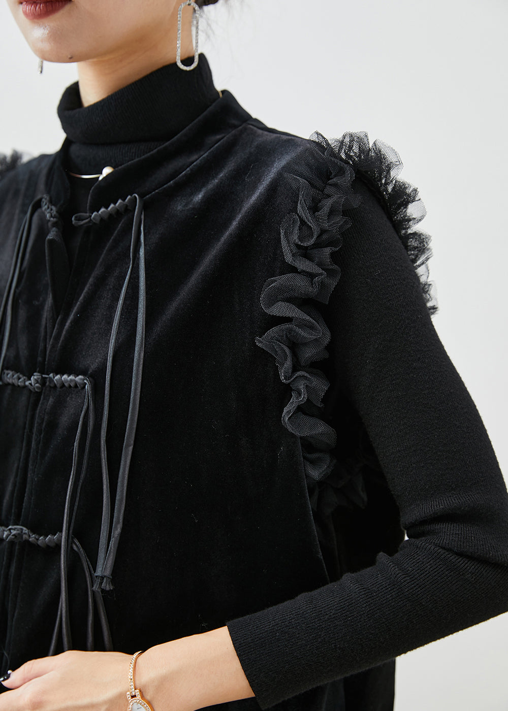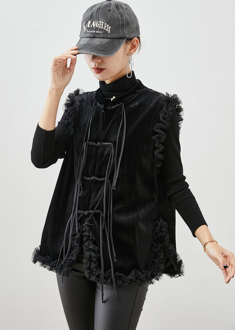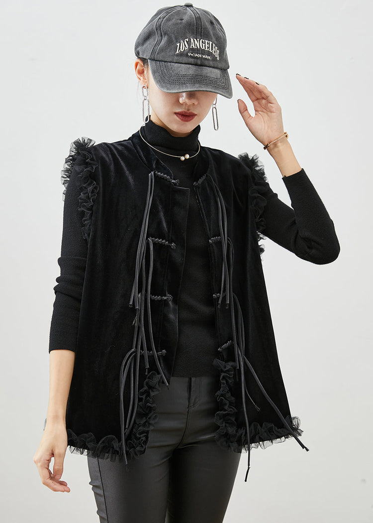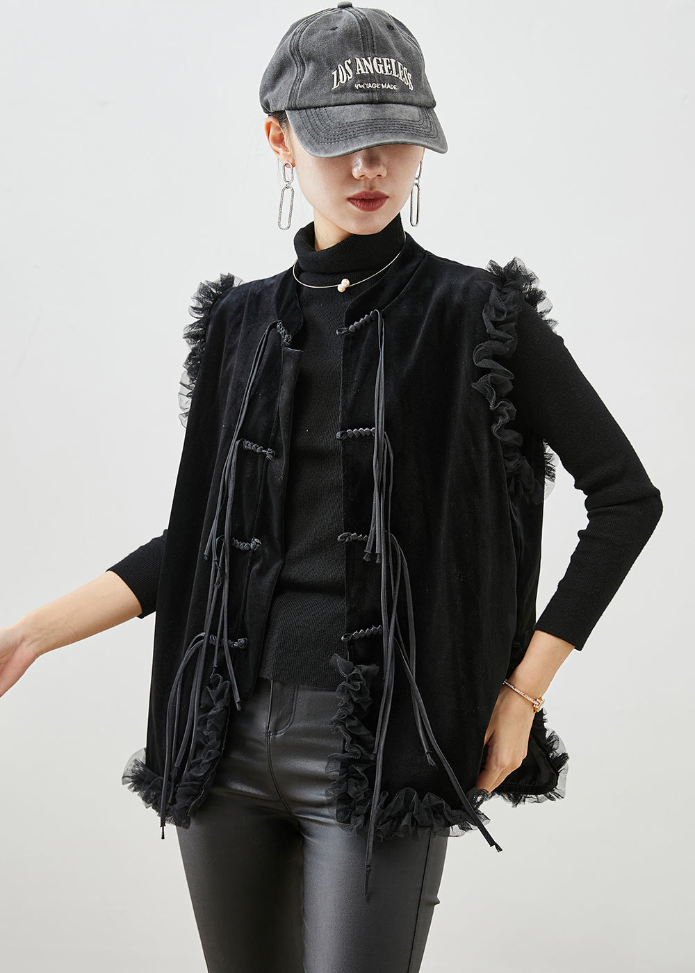 Chinese Style Black Tasseled Ruffled Silk Velour Vest Fall