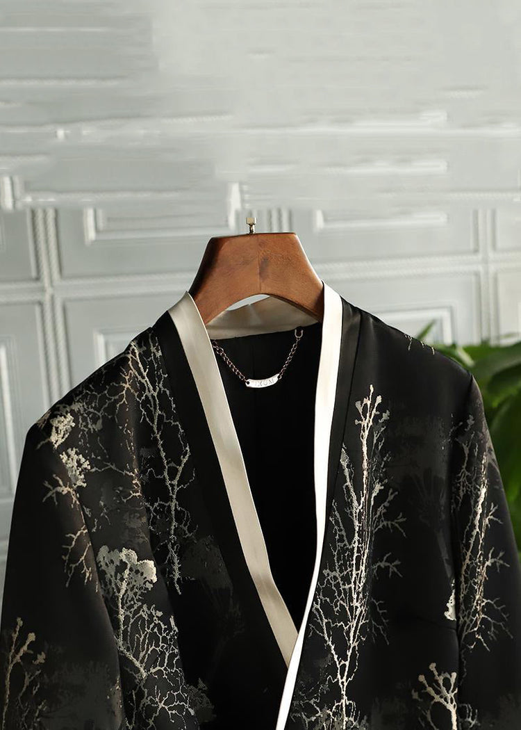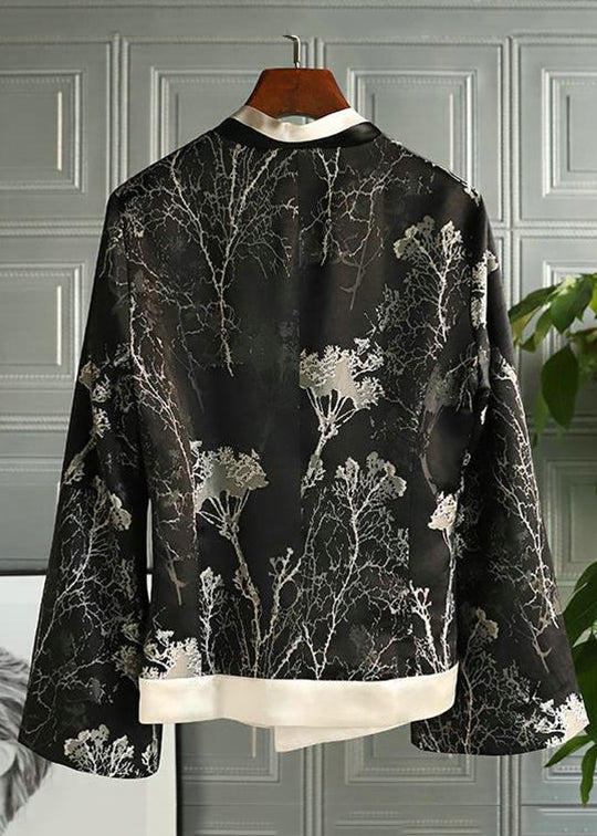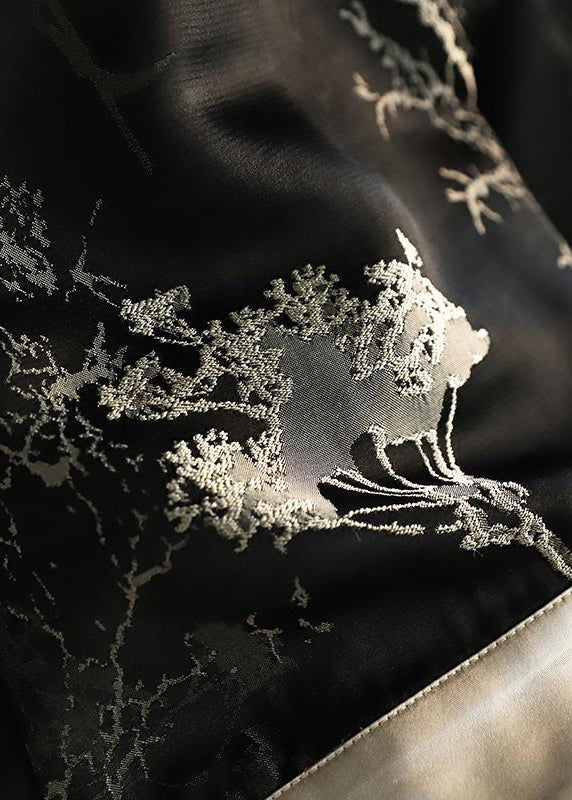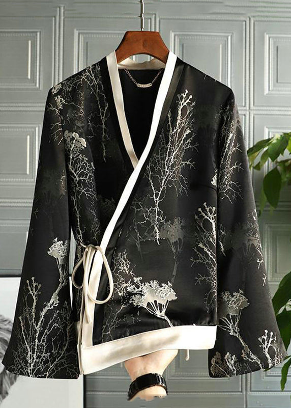 Chinese Style Black V Neck Jacquard Lace Up Silk Tops Fall