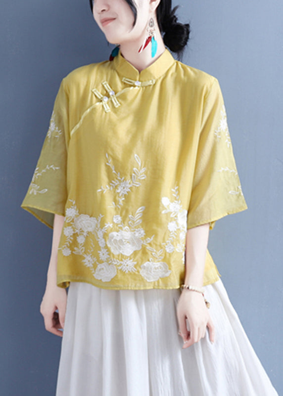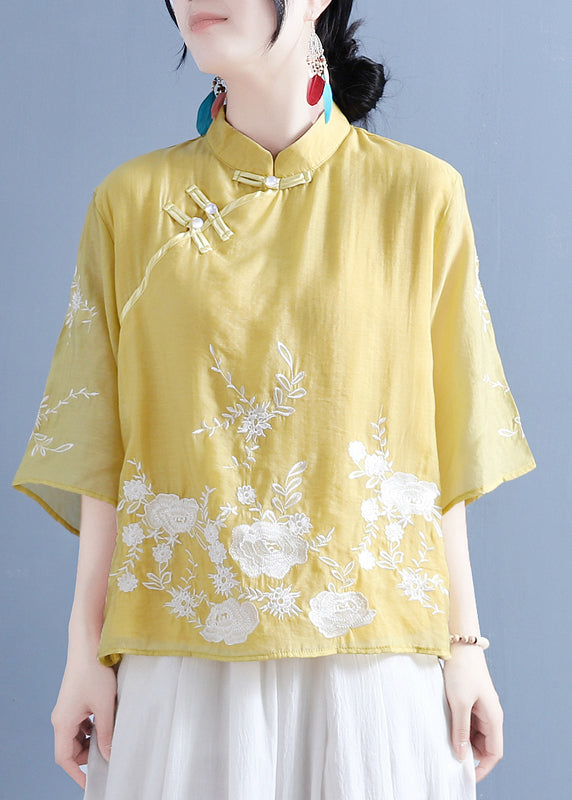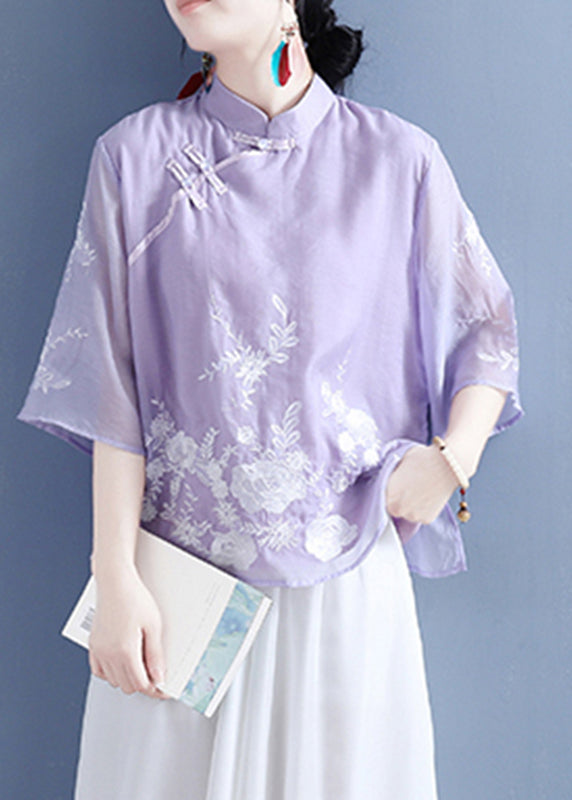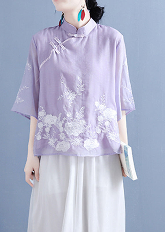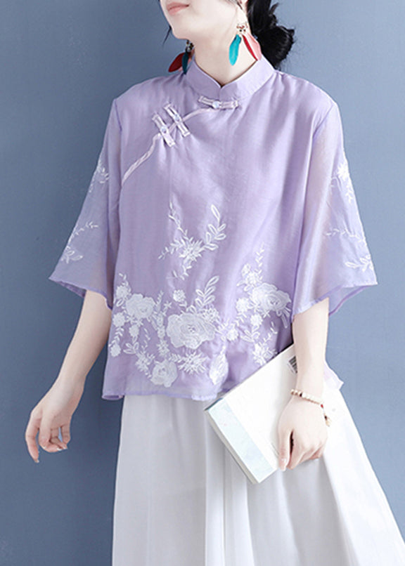 Chinese Style Purple Stand Collar Embroideried Button Silk Linen Shirt Bracelet Sleeve