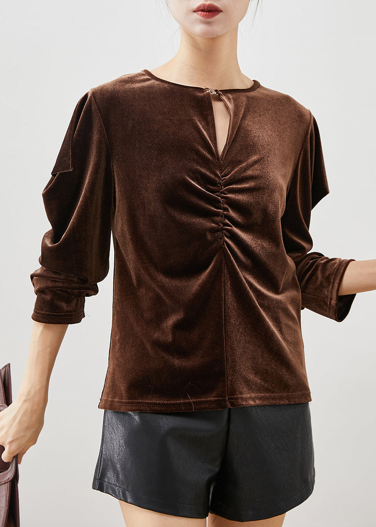 Chocolate Silk Velour Blouses Wrinkled Puff Sleeve