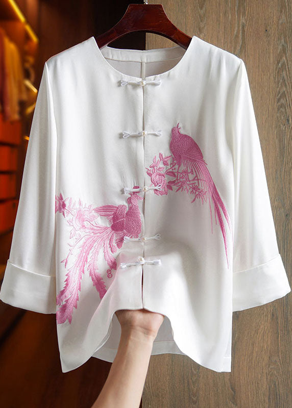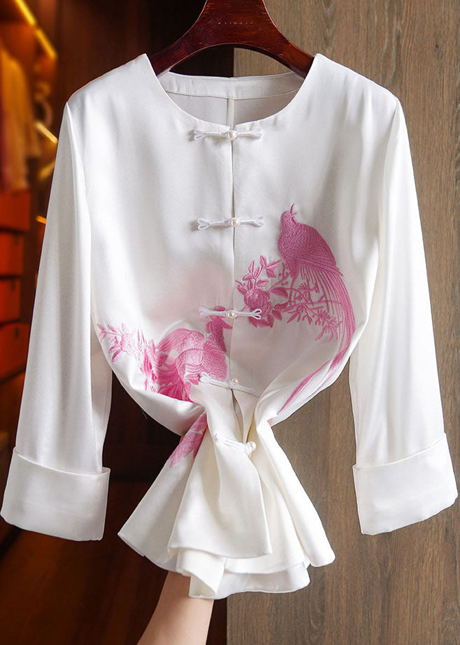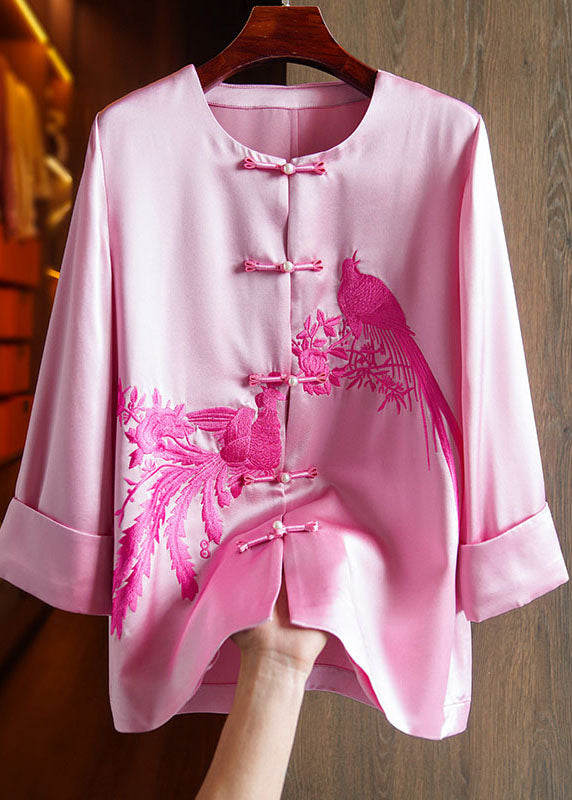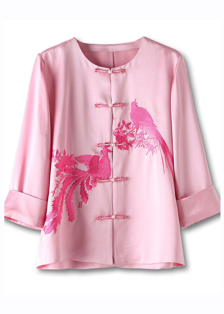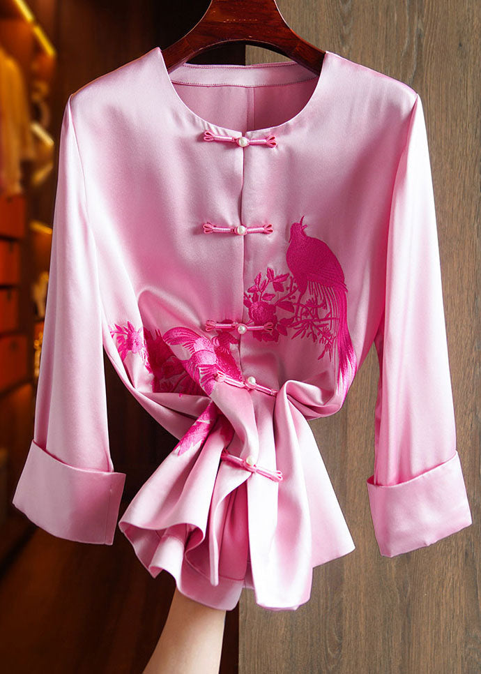 Classy Pink O-Neck Embroideried Floral Silk Top Long Sleeve