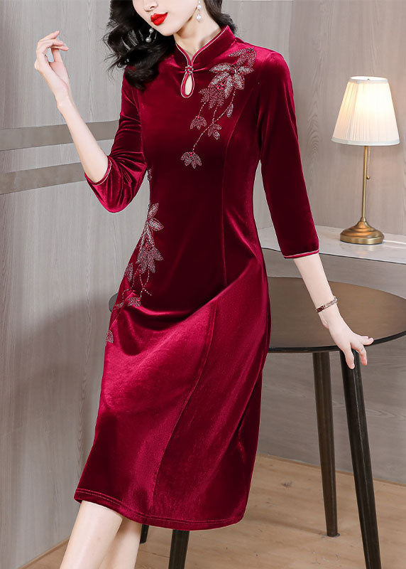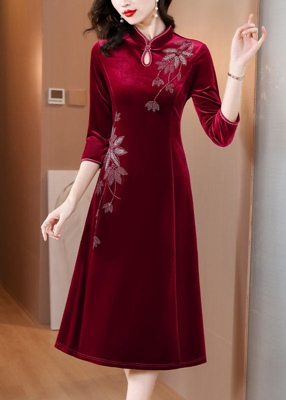 DIY Wine Red Embroideried Slim Silk Velour Long Dress Fall