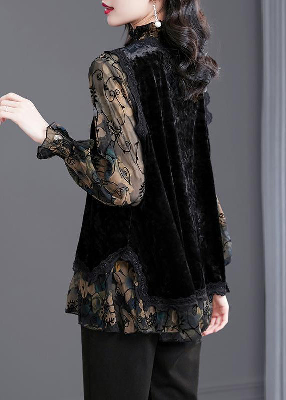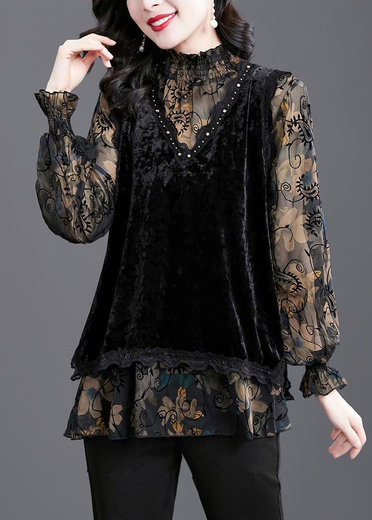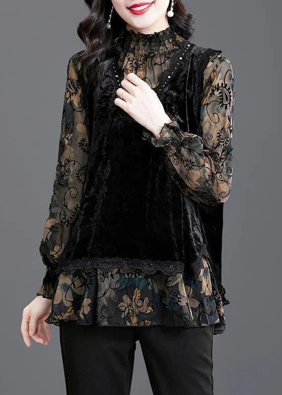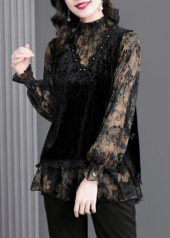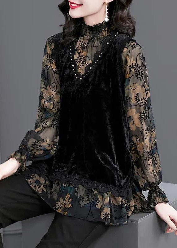Elegant Black Ruffled Print Patchwork Silk Velour Tops Fall