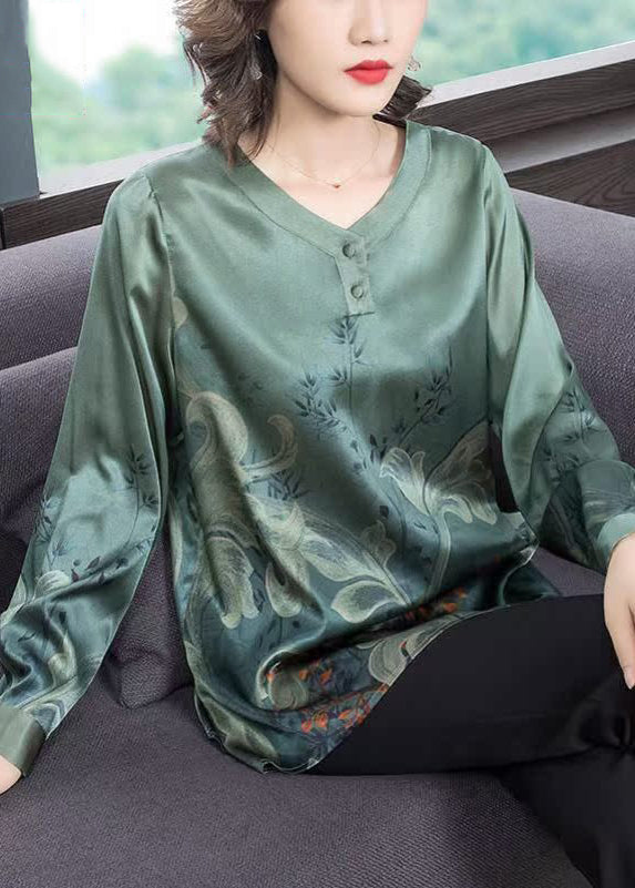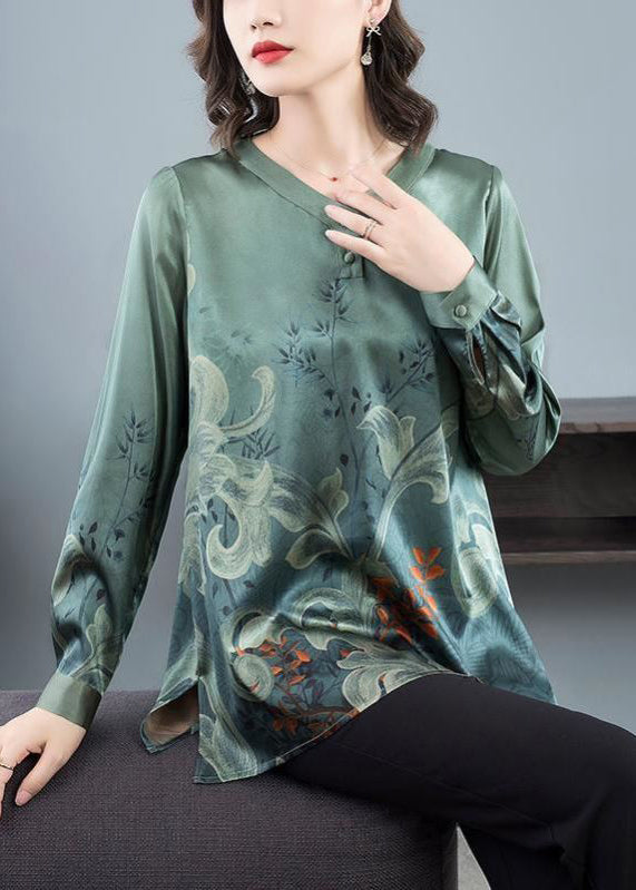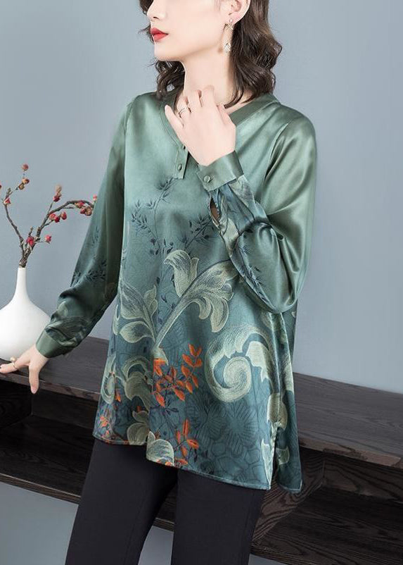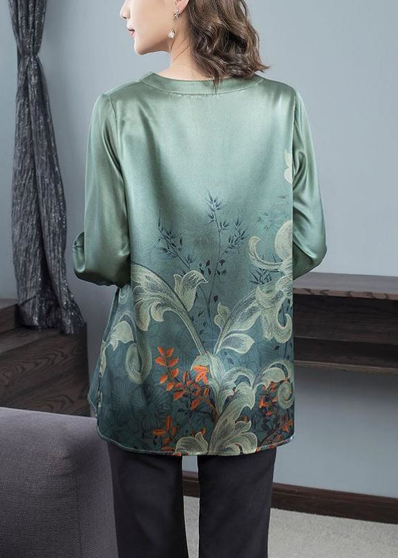 Elegant Blackish Green O Neck Print Patchwork Silk Top Fall