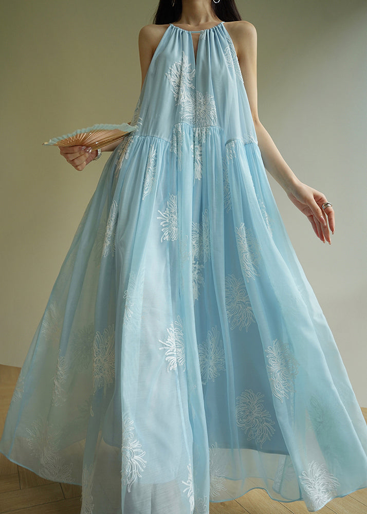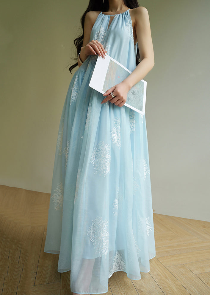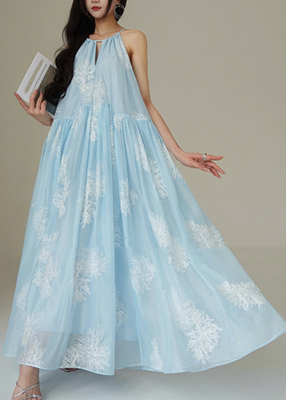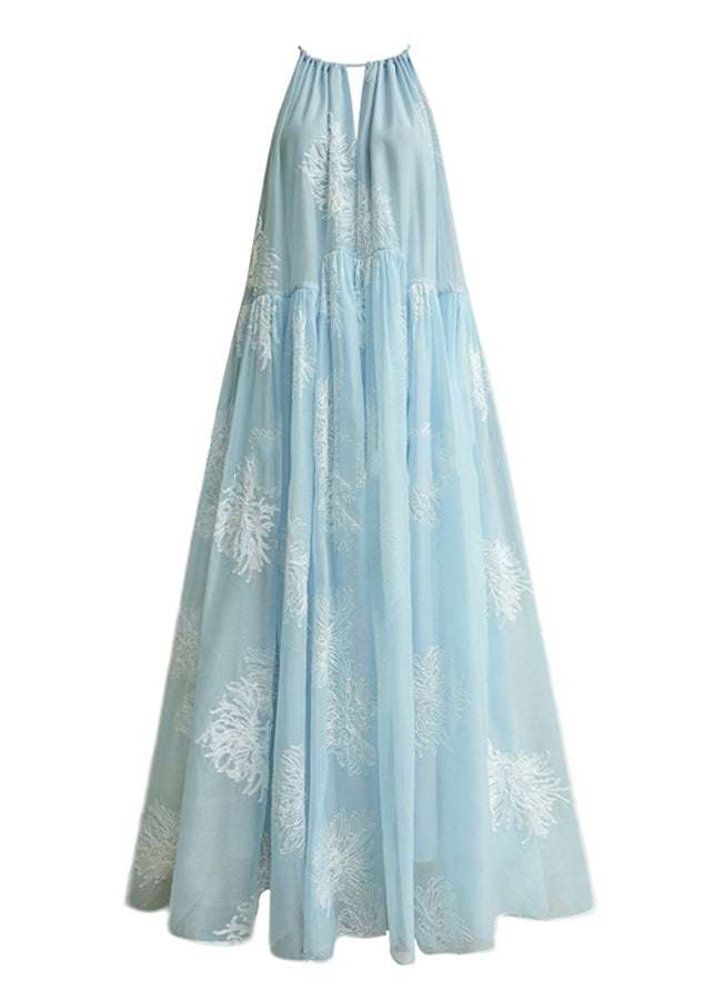 Elegant Blue Embroidered Patchwork Silk Maxi Dress Sleeveless