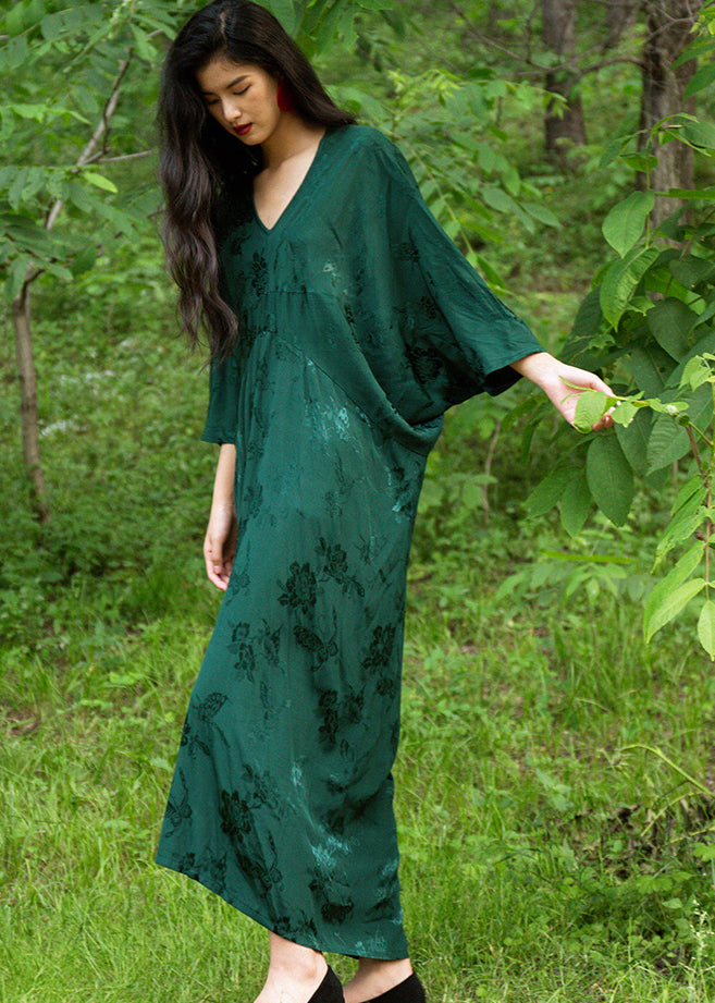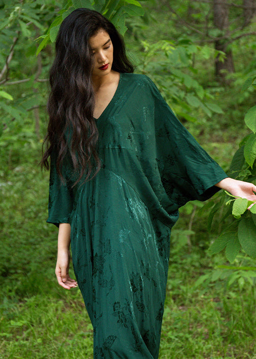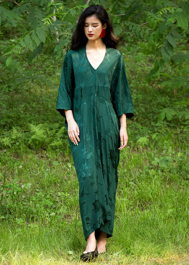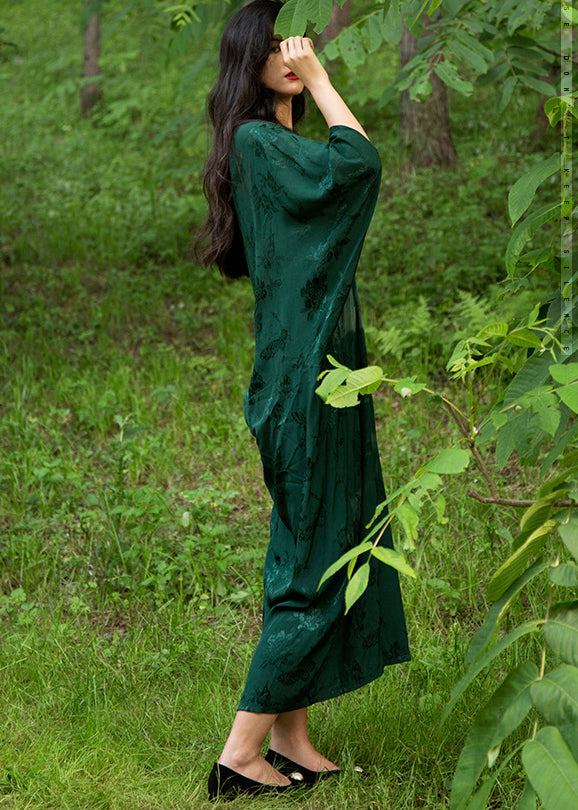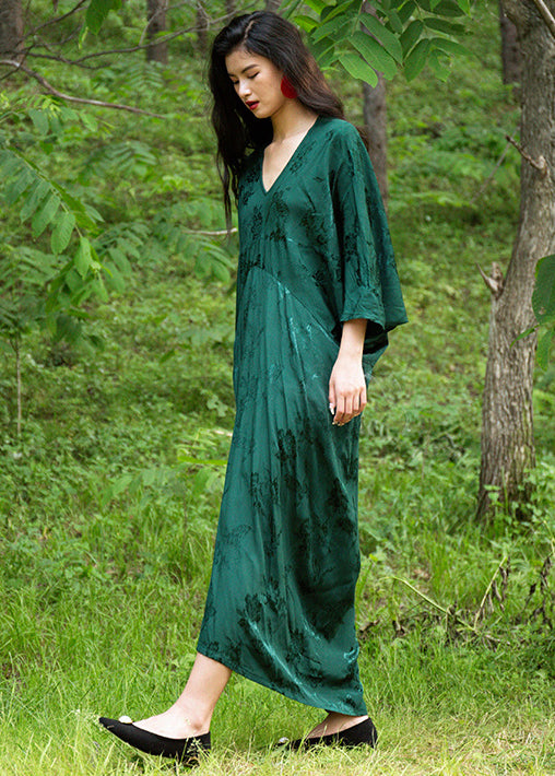 Elegant Green V Neck Jacquard Silk Robe Dresses Batwing Sleeve