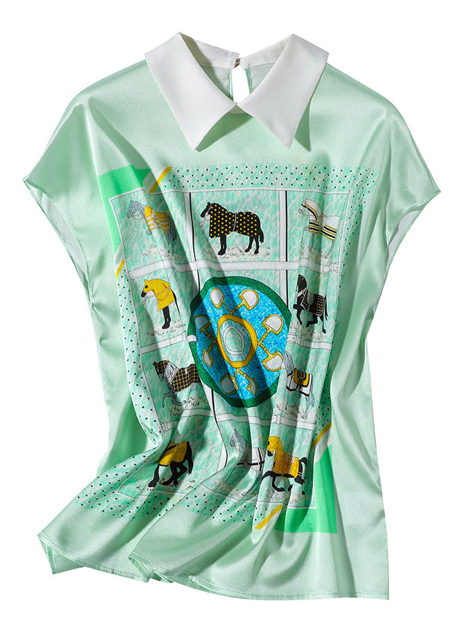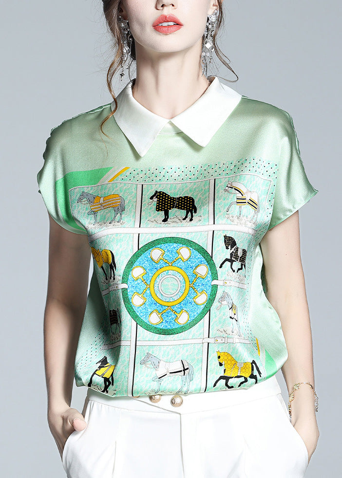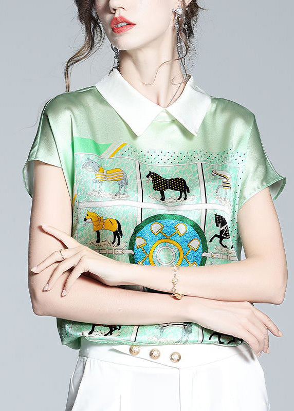 Elegant Light Green Peter Pan Collar Print Silk T Shirts Short Sleeve