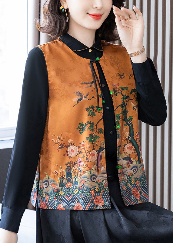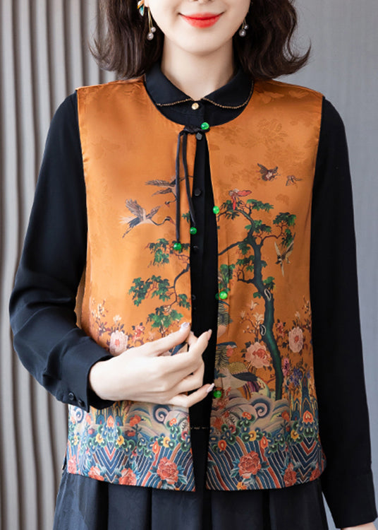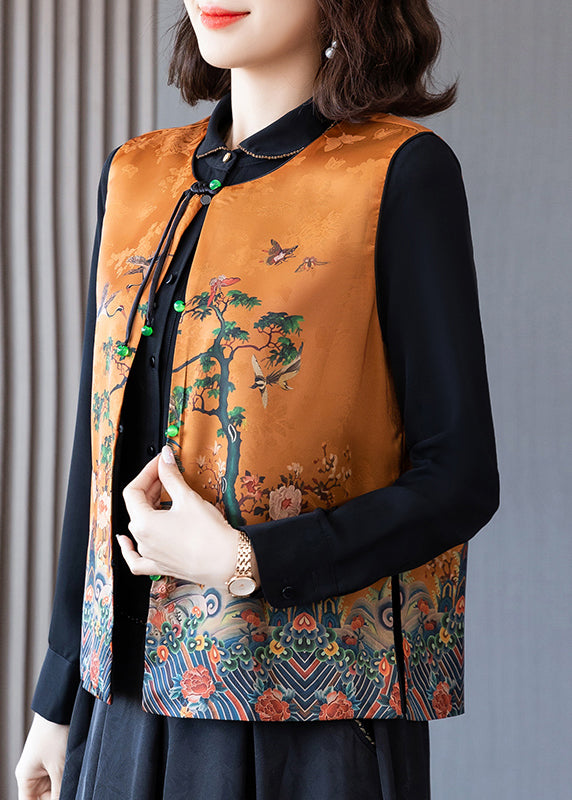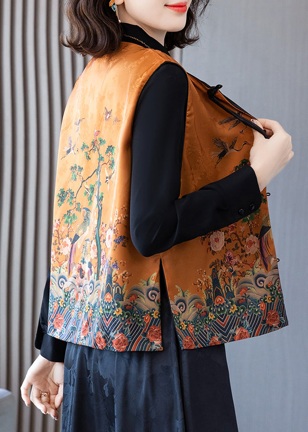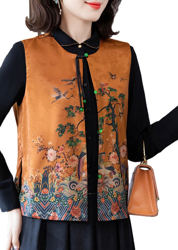 Elegant Orange O-Neck Print Button Side Open Silk Waistcoat Spring