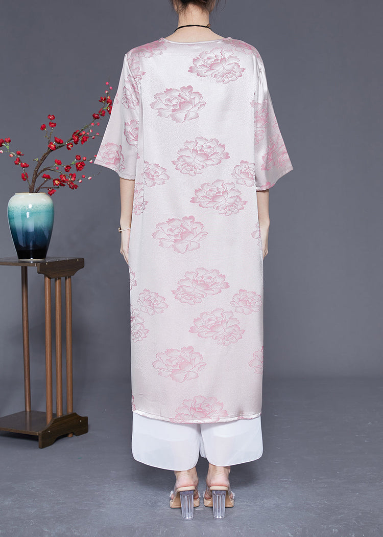 Elegant Pink O-Neck Print Tassel Silk Long Dress Half Sleeve