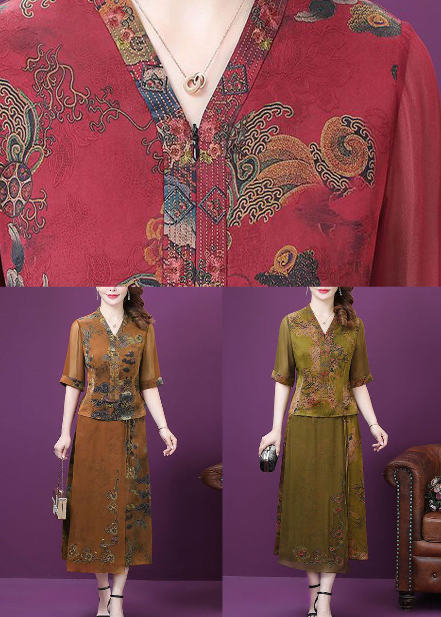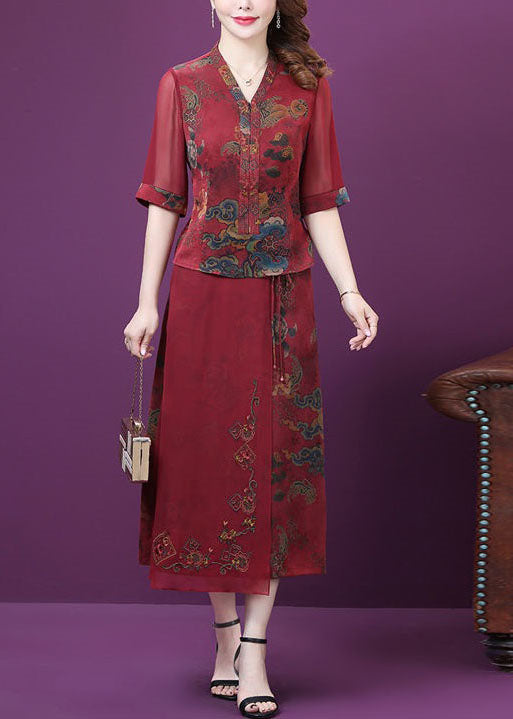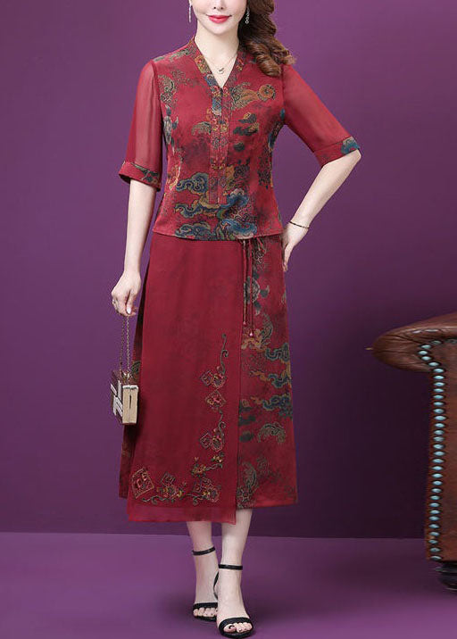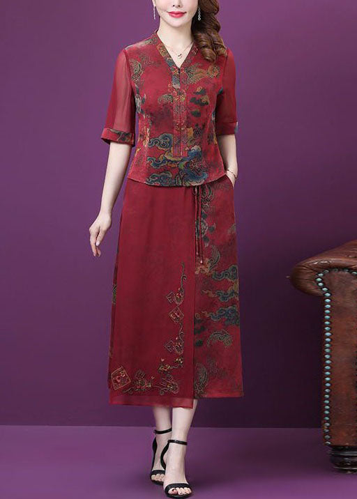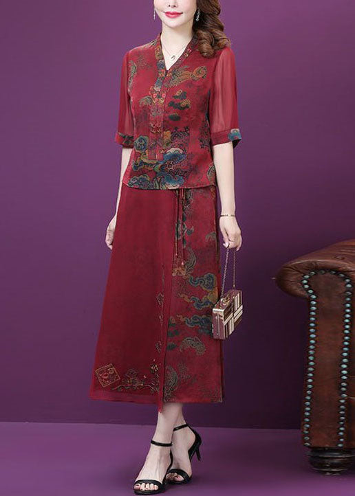 Elegant Red Print Patchwork Tops And Pants Silk Outfit Summer