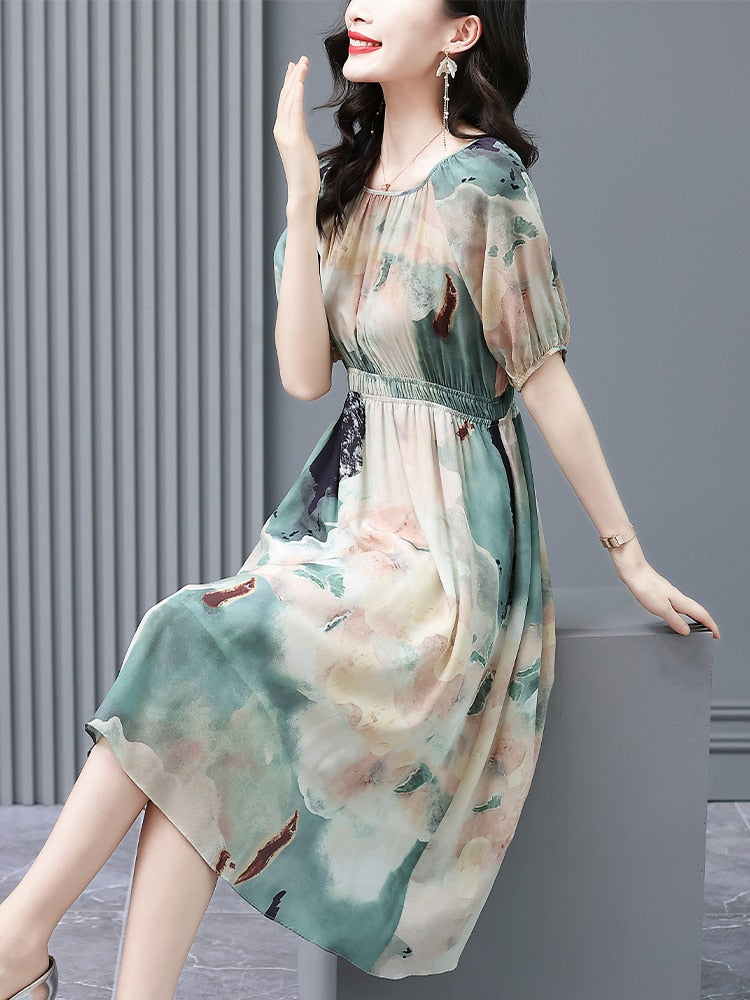 Elegant Summer Floral Silk Midi Dress Short Sleeve