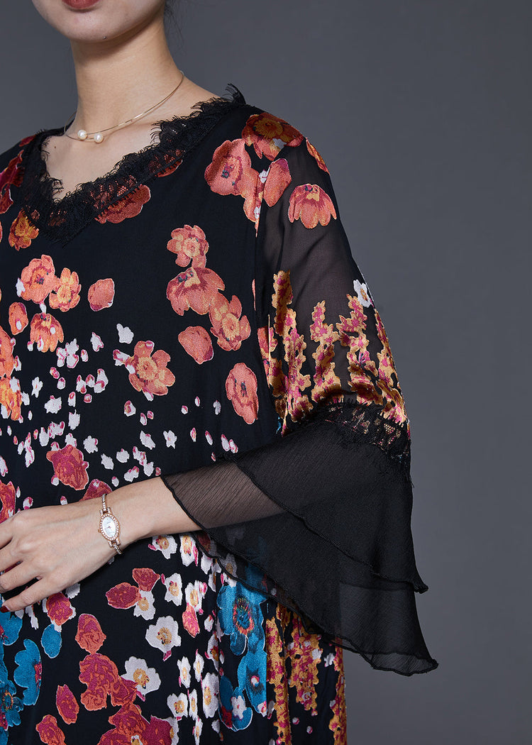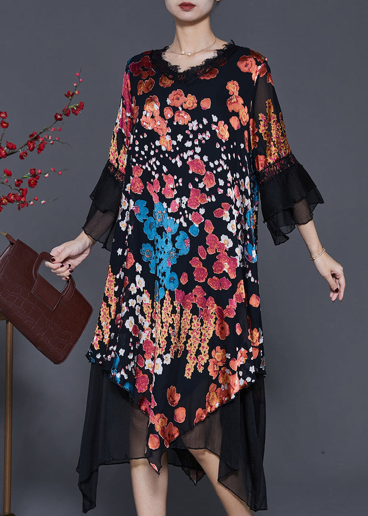 Fashion Black Asymmetrical Print Silk Dresses Flare Sleeve
