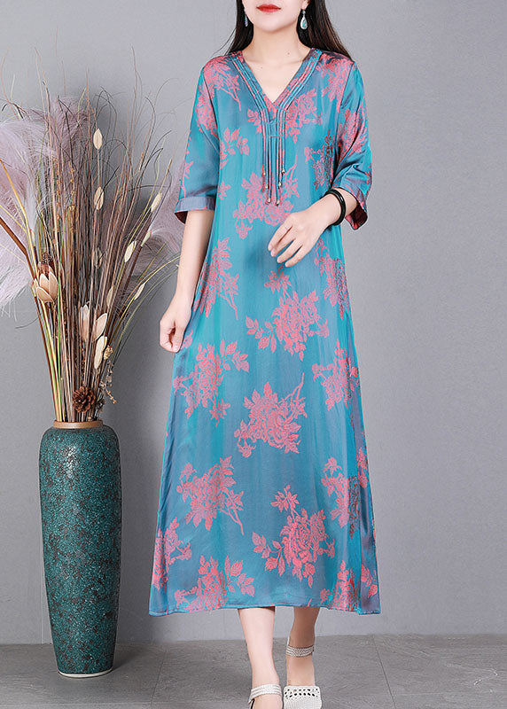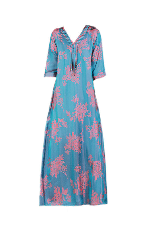 Fashion Lake Blue V Neck Jacquard Tassel Silk Holiday Dress Half Sleeve