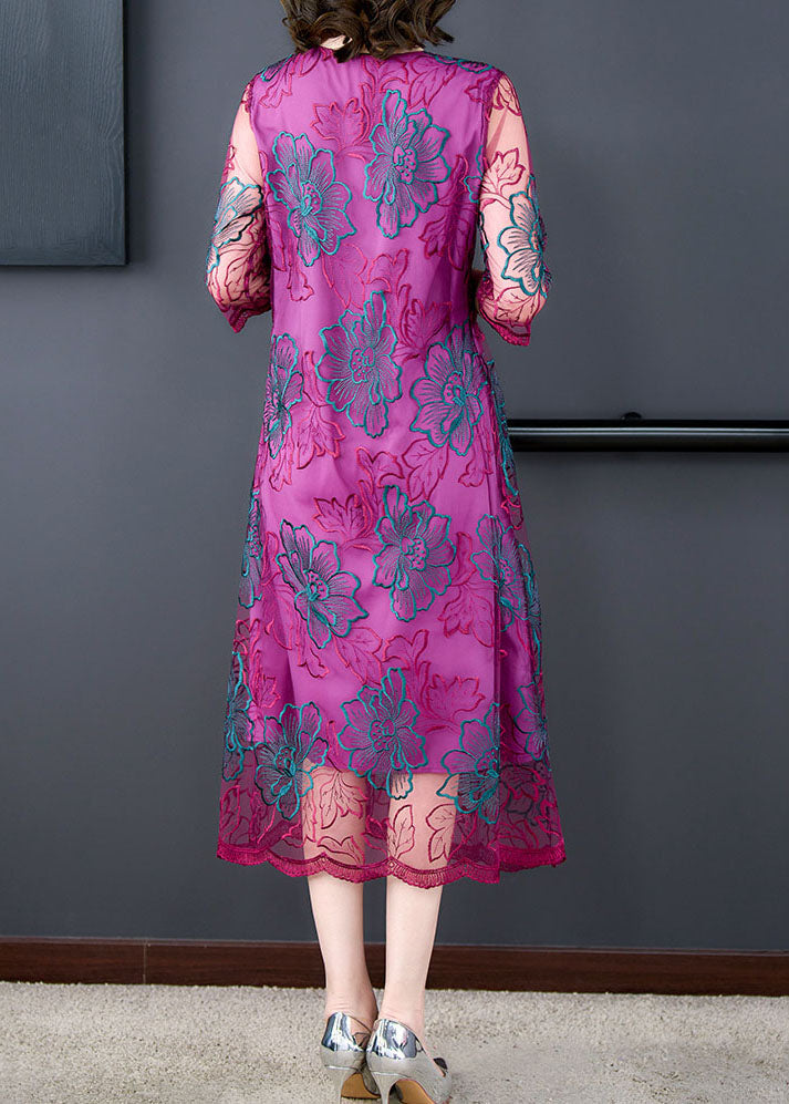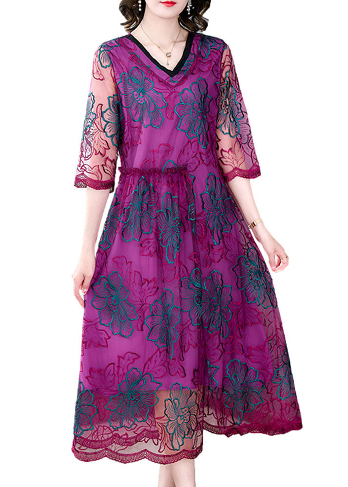 Fashion Rose V Neck Embroideried Patchwork Silk Dresses Summer