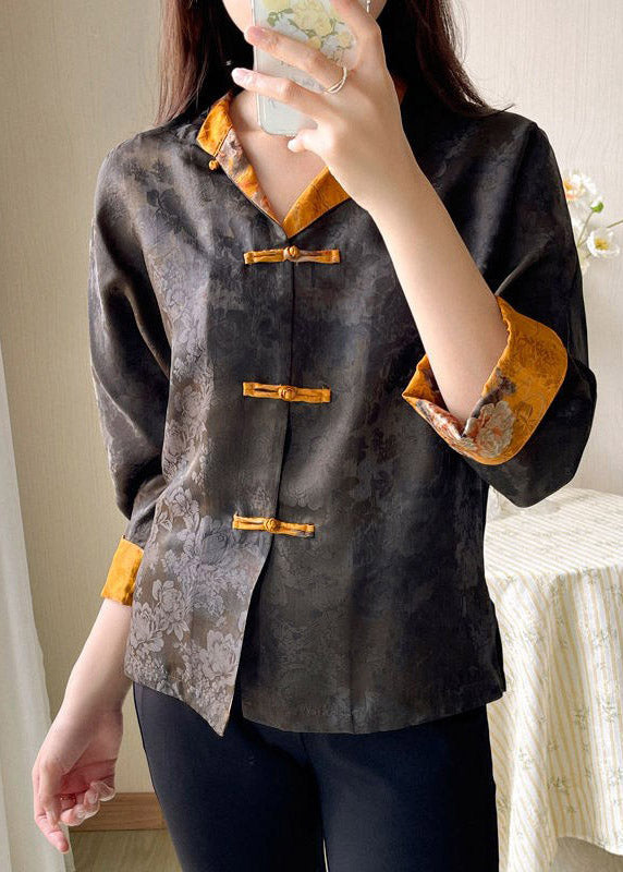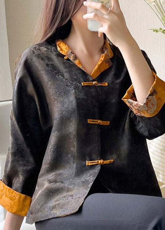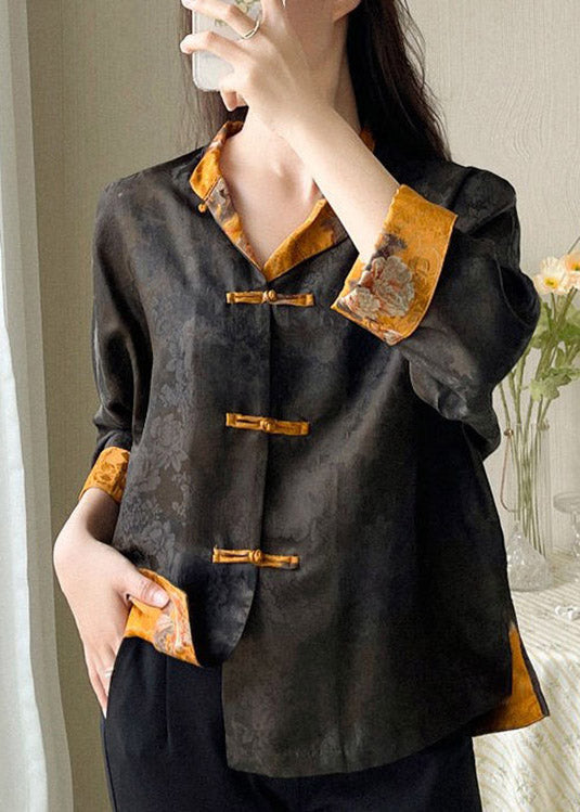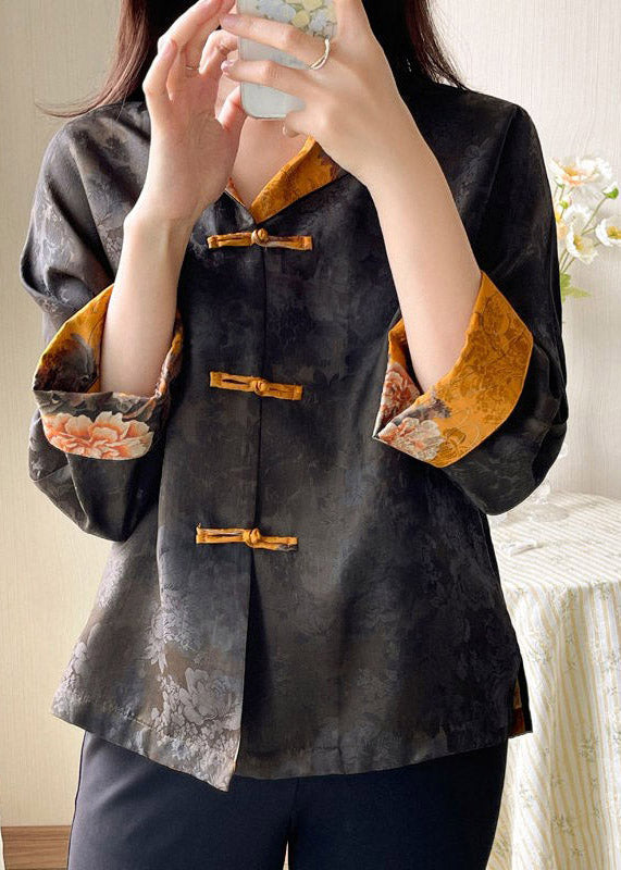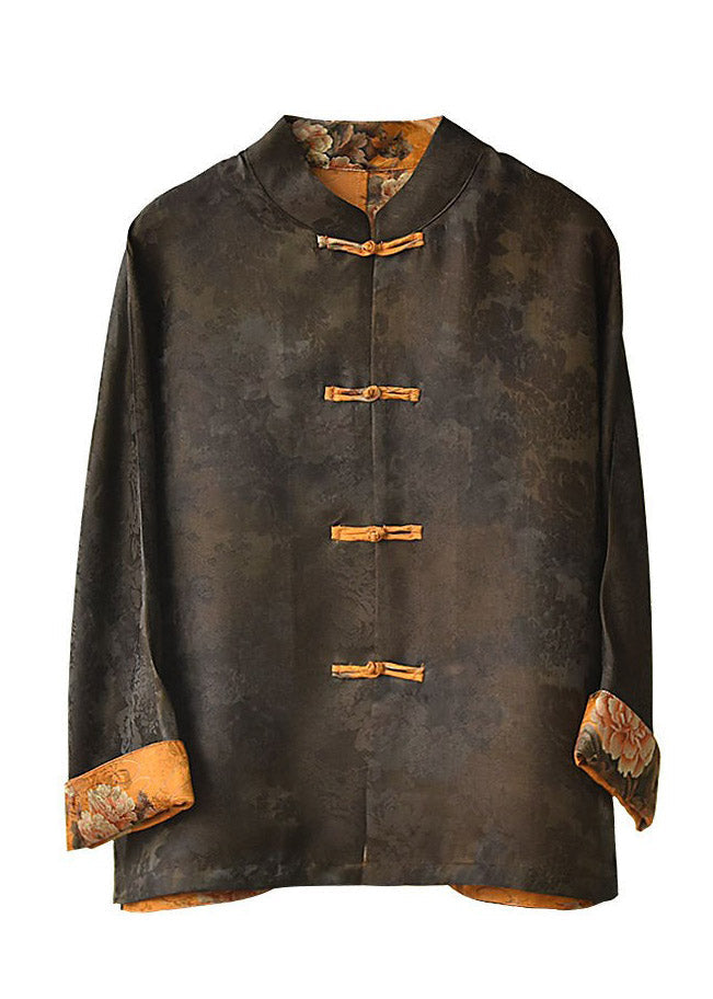 Fashion Stand Collar Print Button Side Open Silk Coat Long Sleeve