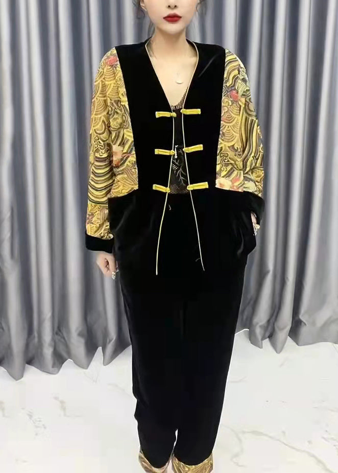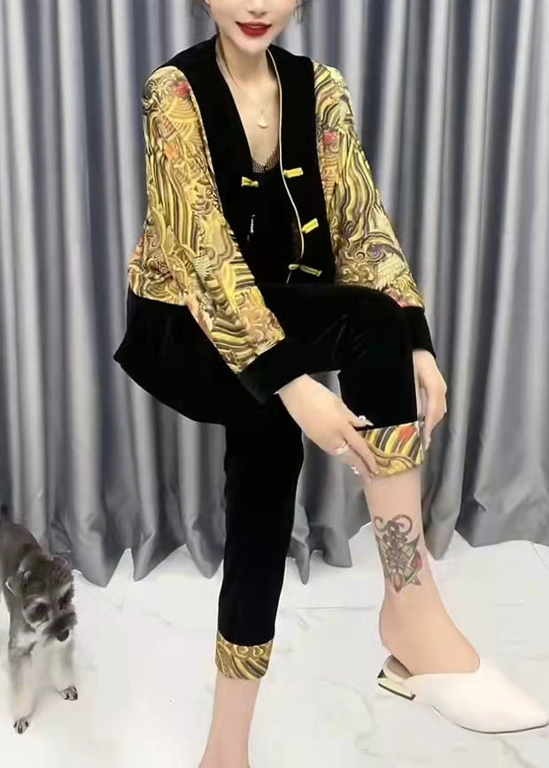 Fashion Yellow V Neck Print Patchwork Silk Velour Coats And Crop Pants Two Pieces Set Fall