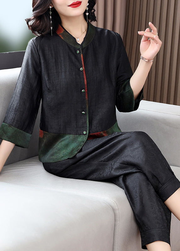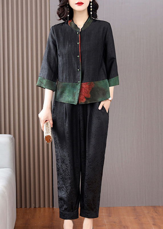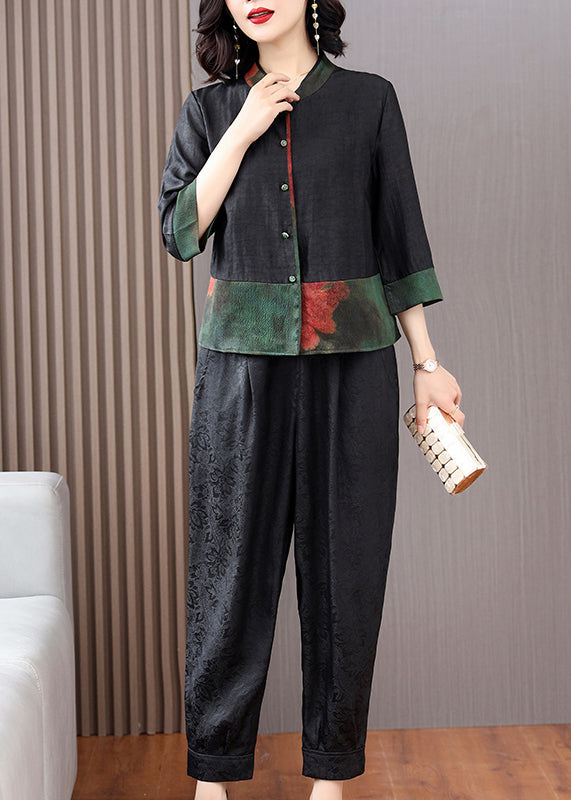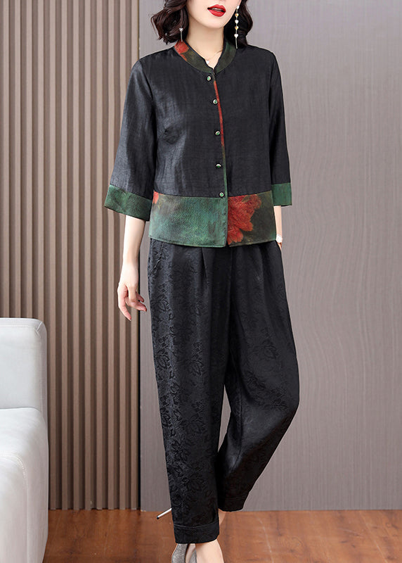 Fine Black Print Button Shirts And Crop Pants Silk Two Piece Set Fall