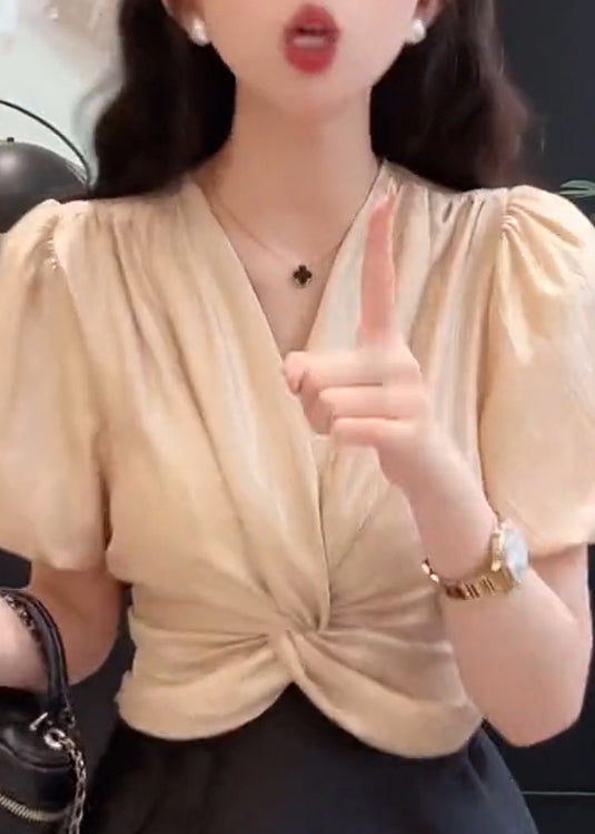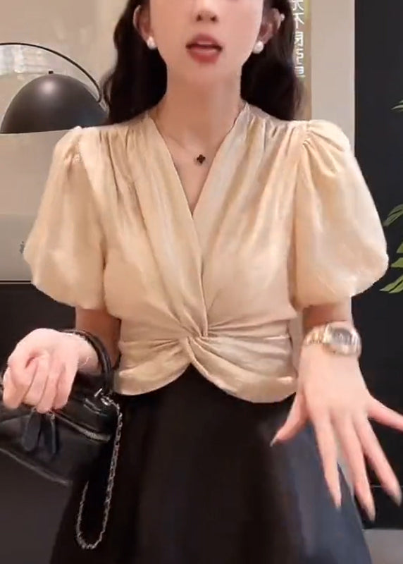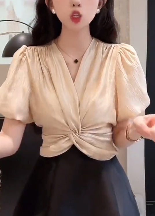 French Champagne V Neck Puff Sleeve Patchwork Silk Top