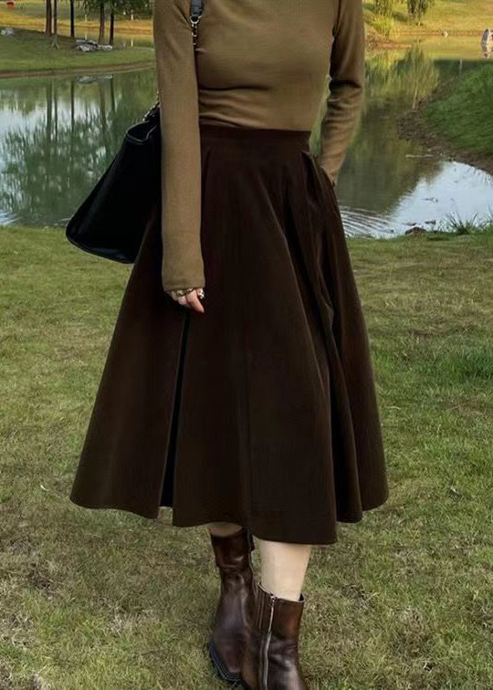 French Coffee High Waist Pockets Patchwork Silk Velour Skirt Fall