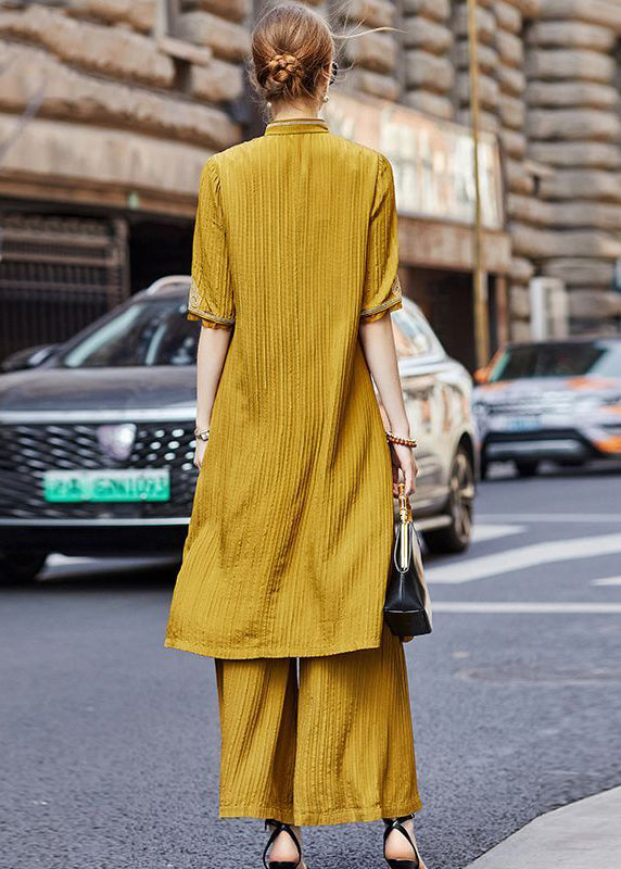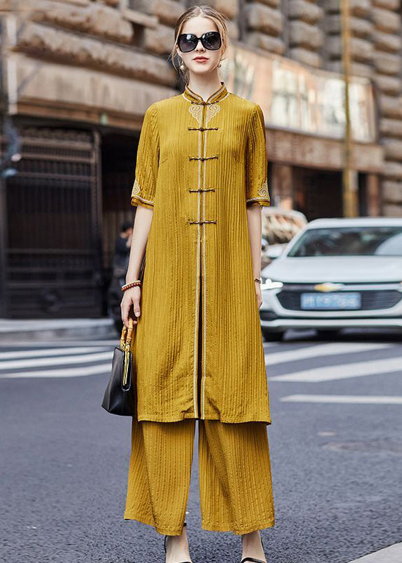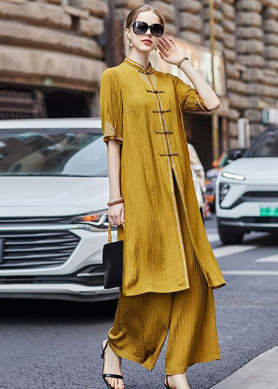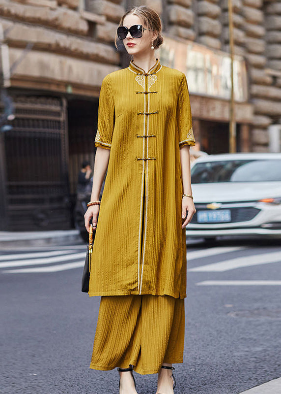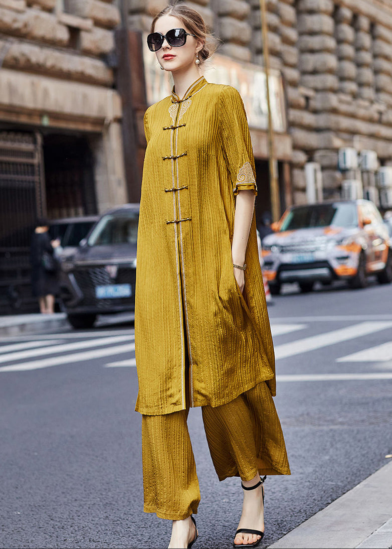 French Yellow Embroideried Chinese Button Silk Two-Piece Set Fall