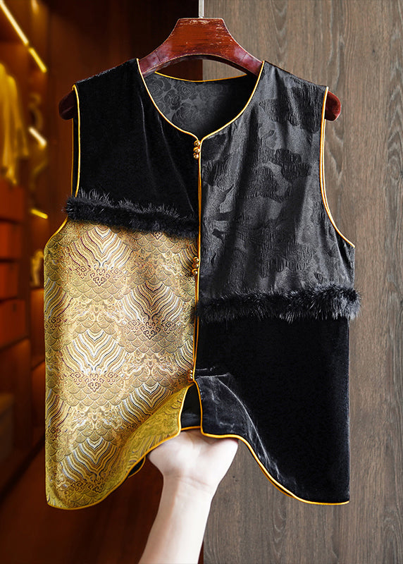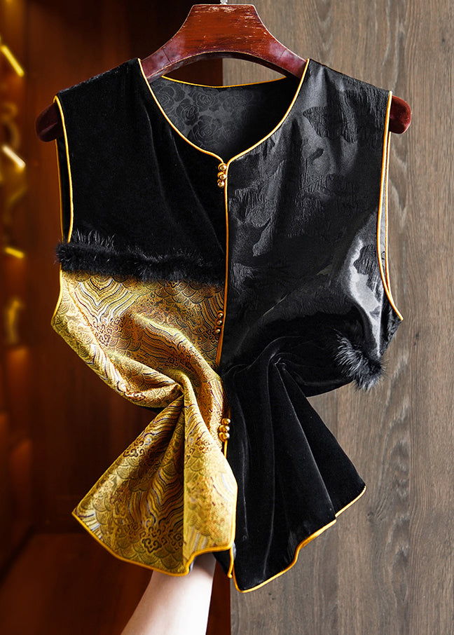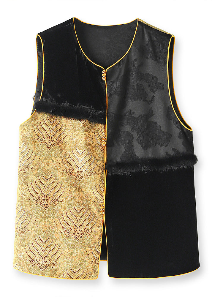 Handmade Black Jacquard Mink Hair Patchwork Silk Vest Sleeveless