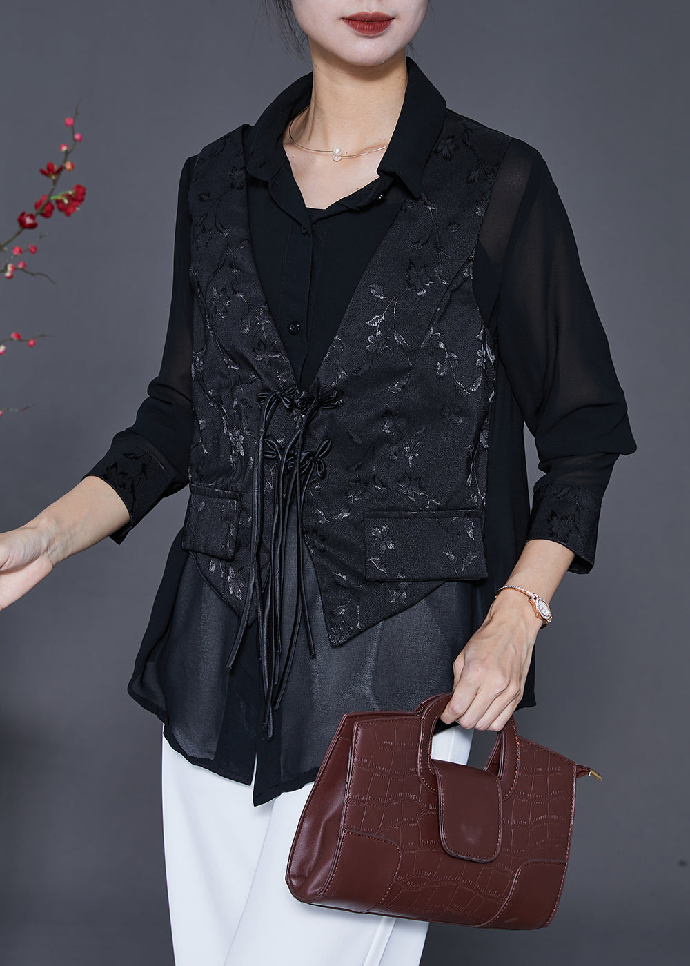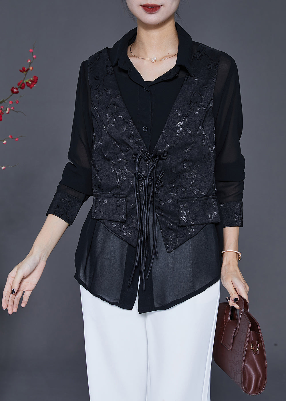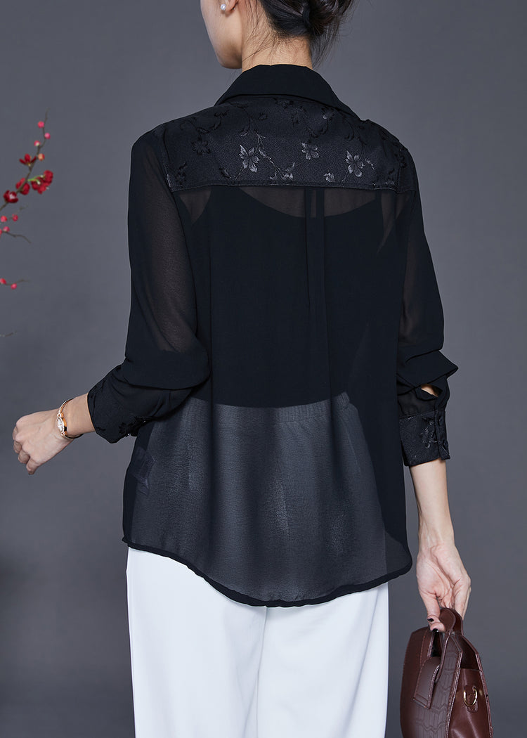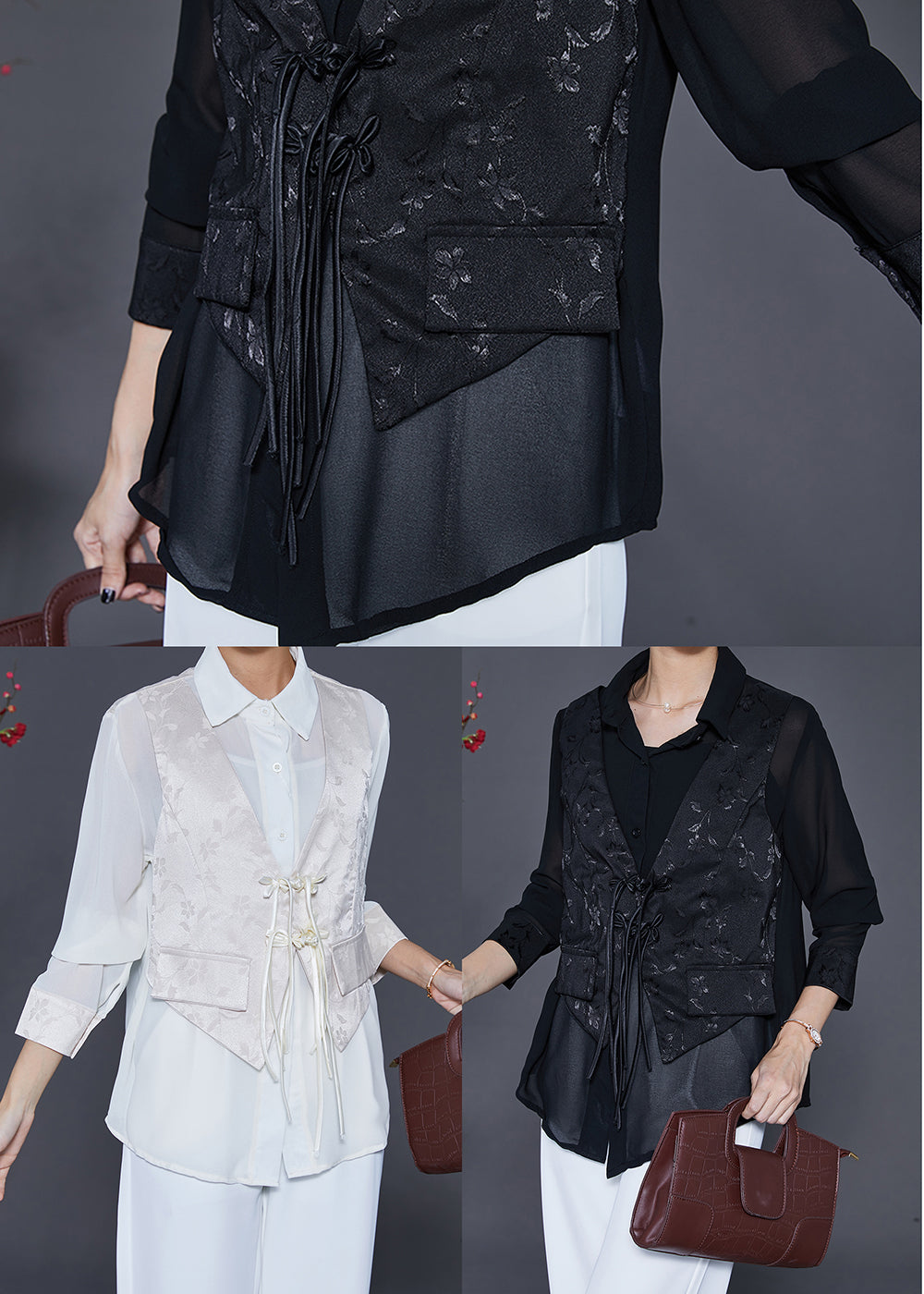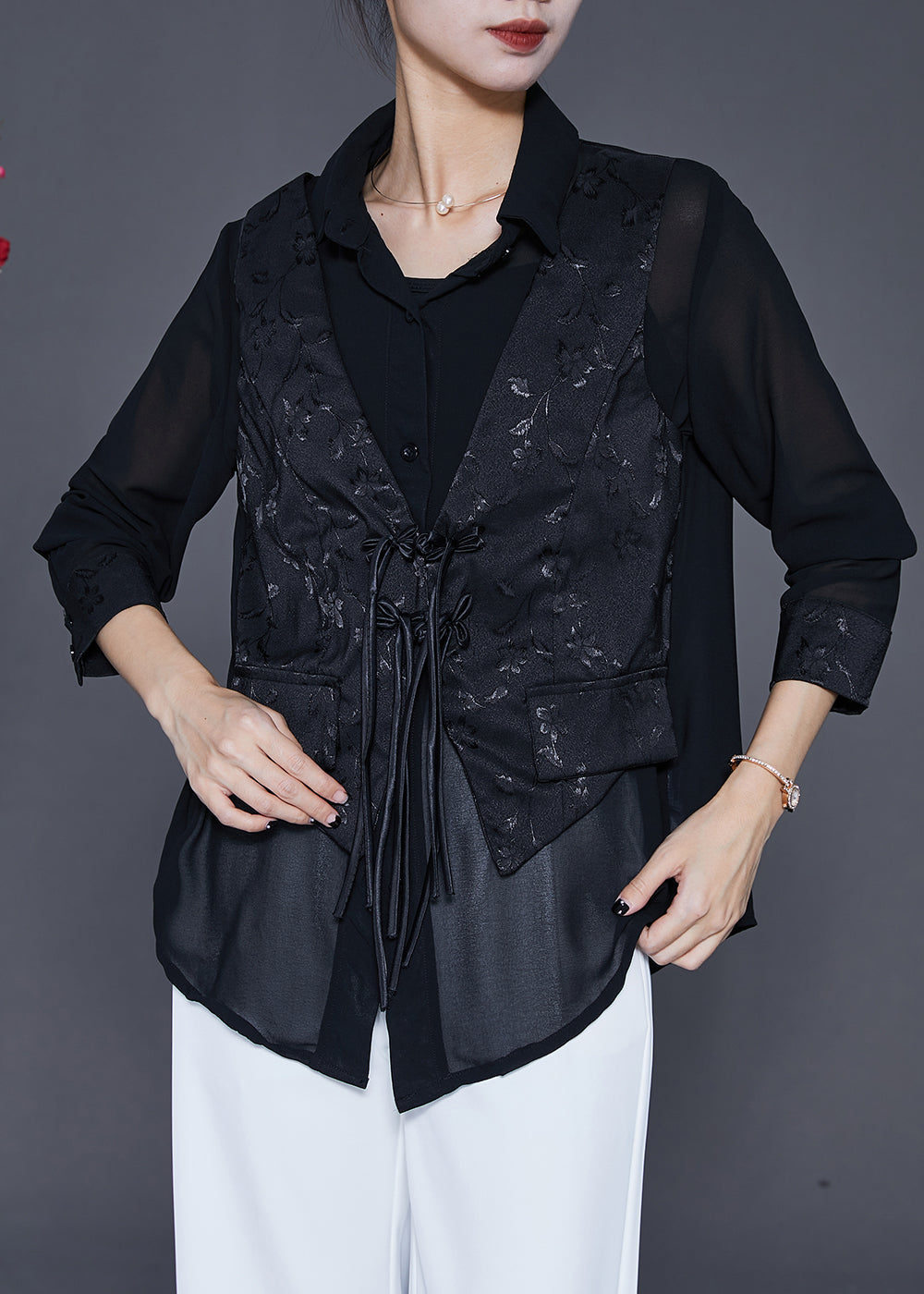 Handmade Black Tasseled Patchwork Silk Fake Two Piece Blouse Top Fall