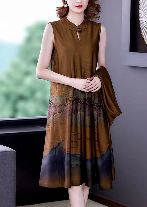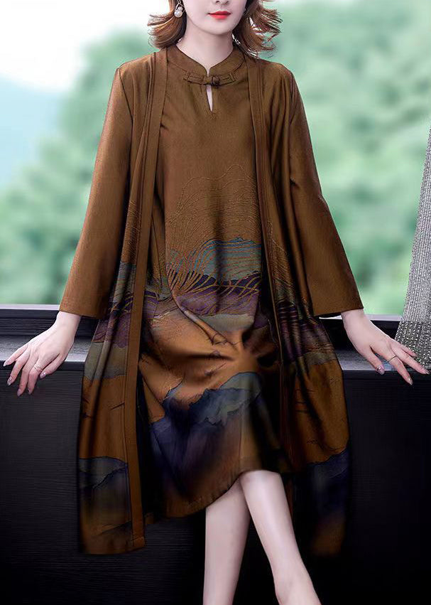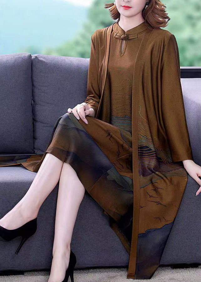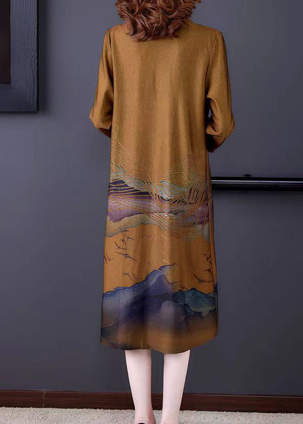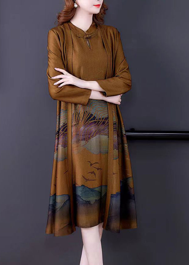 Italian Yellow Stand Collar Print Silk Trench Coats And Dress Two Piece Set Long Sleeve