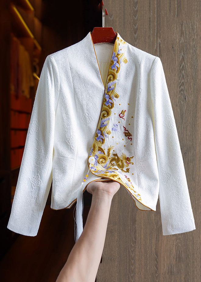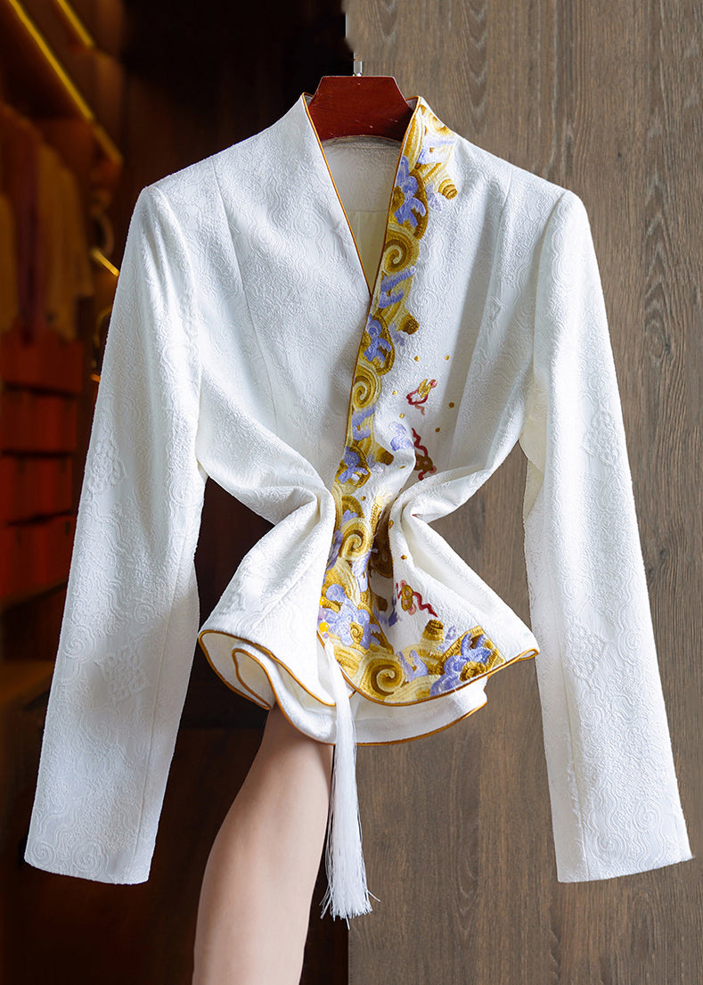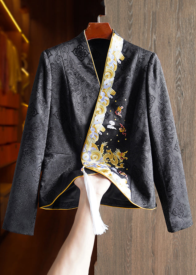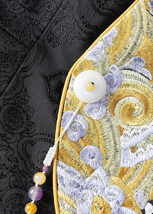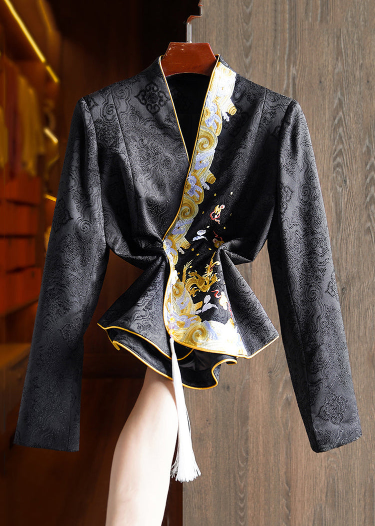 Jacquard Black Embroideried Button Patchwork Silk Tops Fall