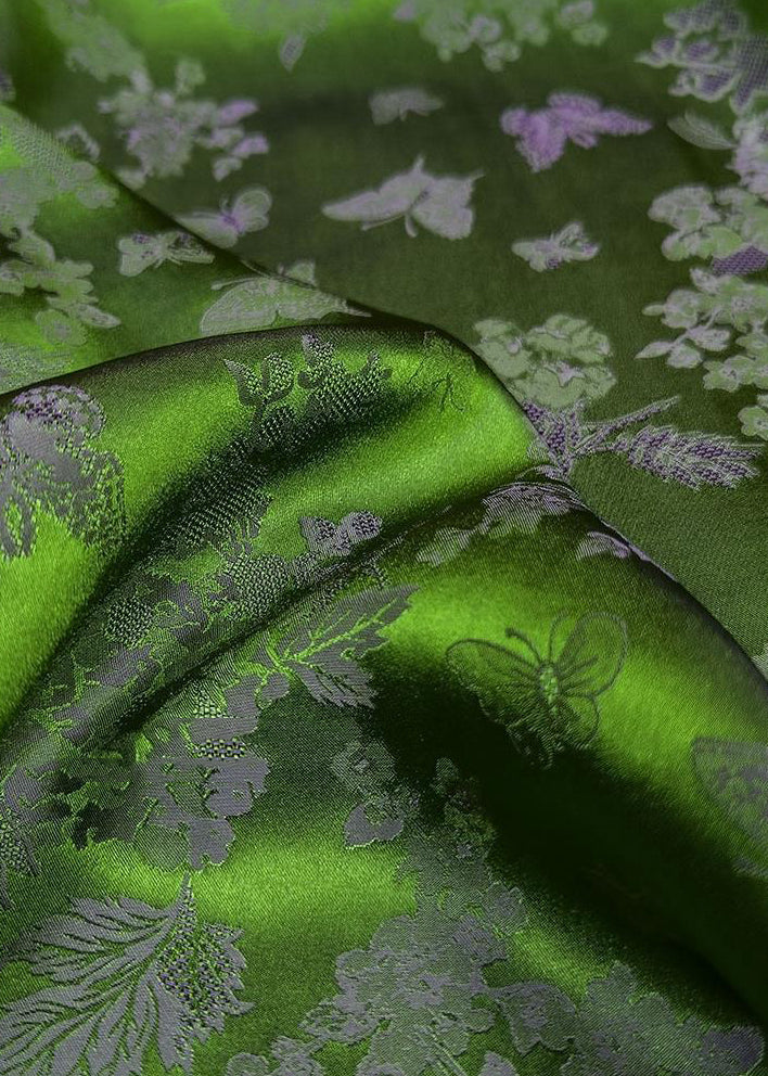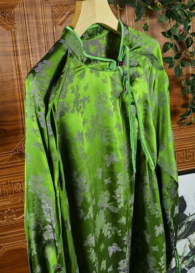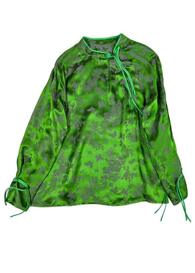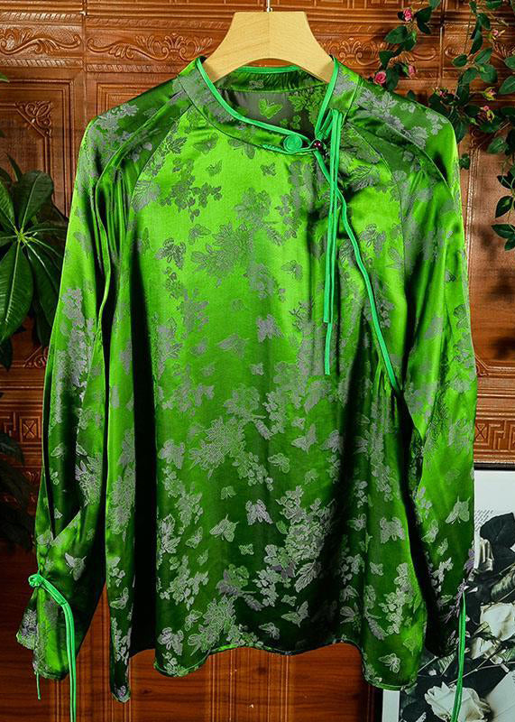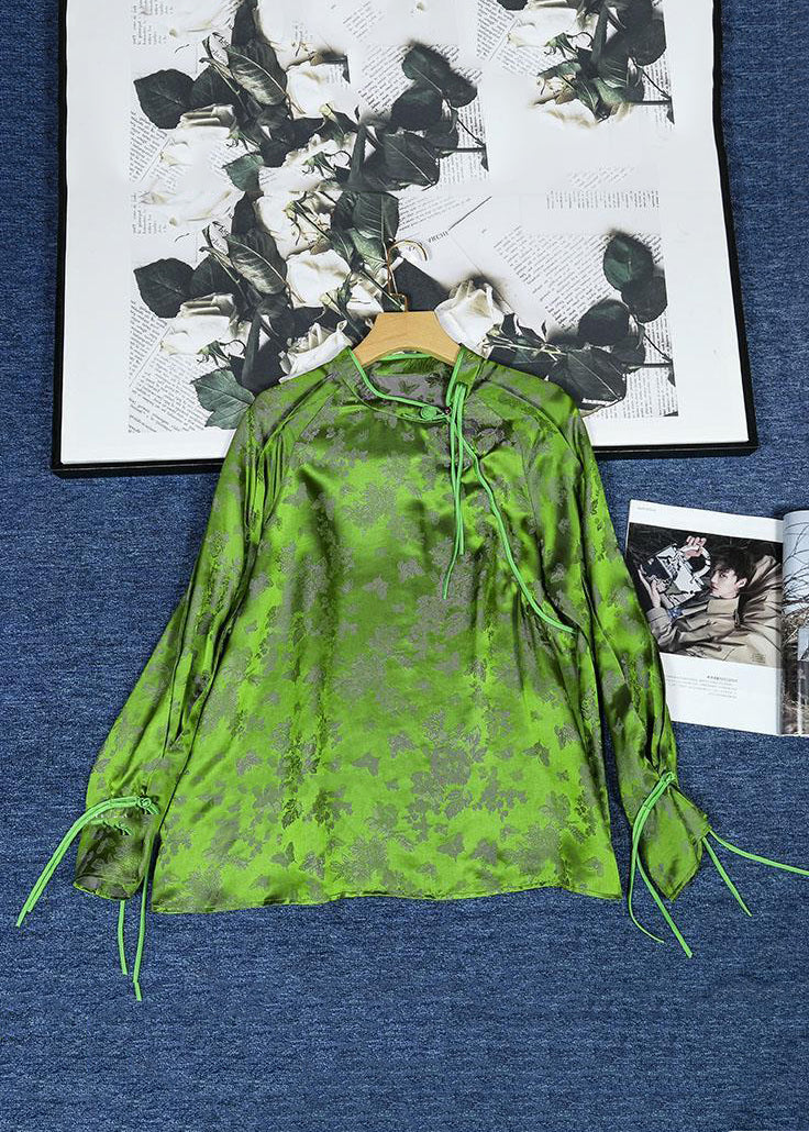 Jacquard Green Tasseled Button Patchwork Silk Shirts Fall
