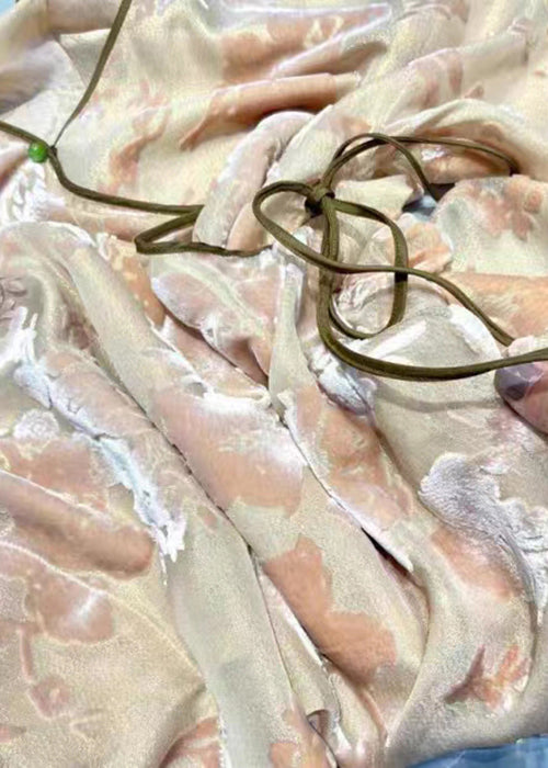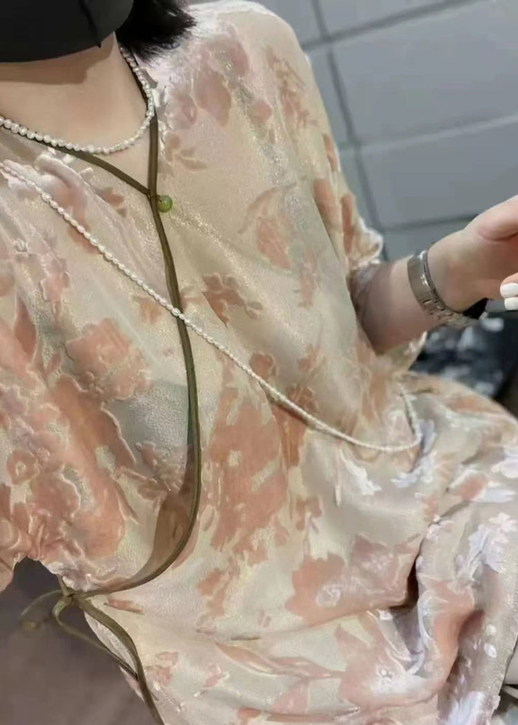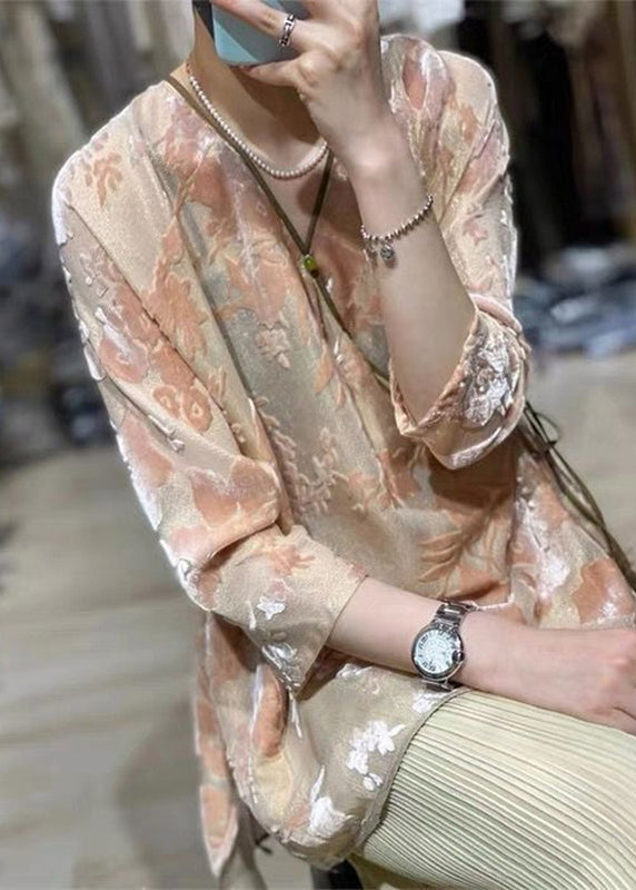 Jacquard Pink V Neck Lace Up Patchwork Silk Velour Tops Fall