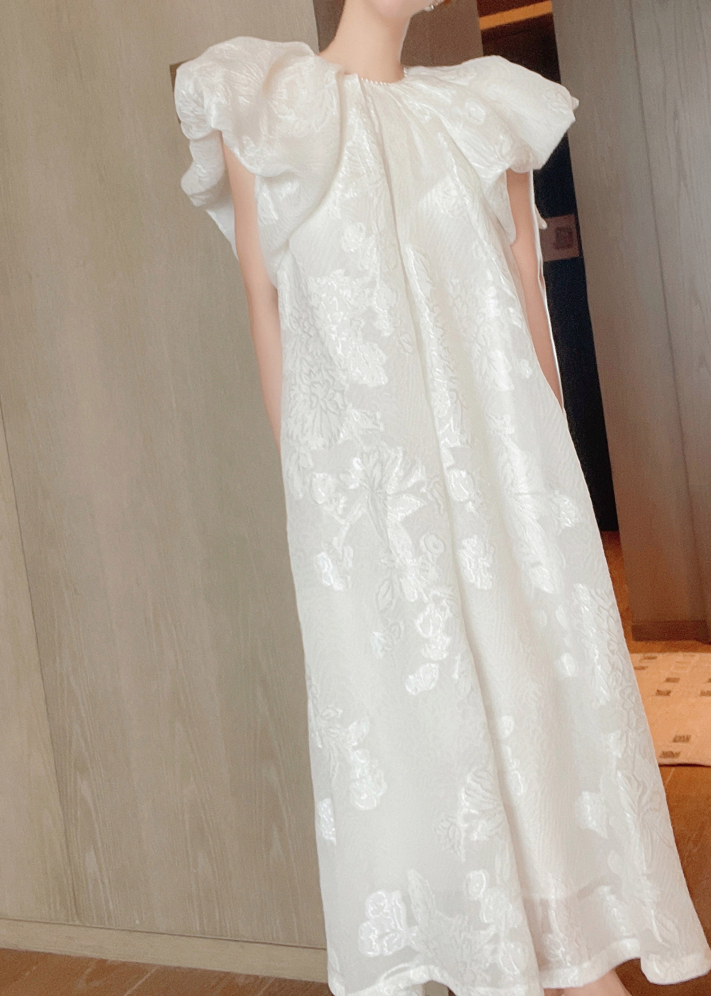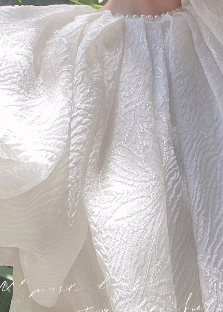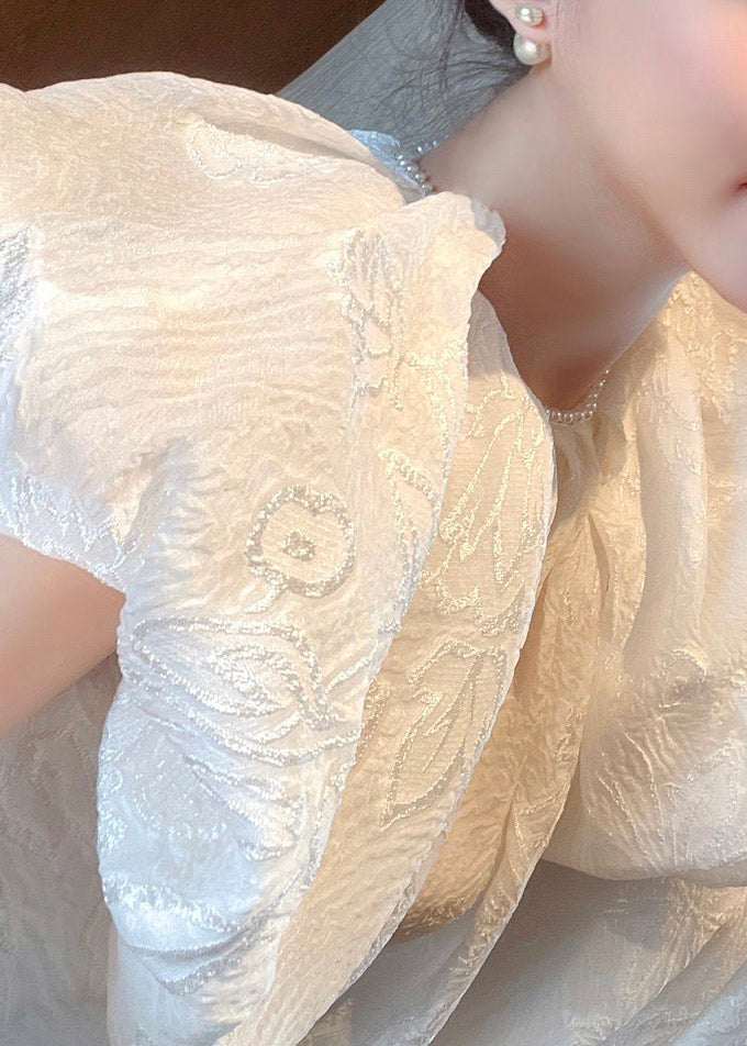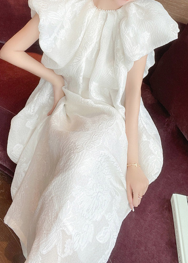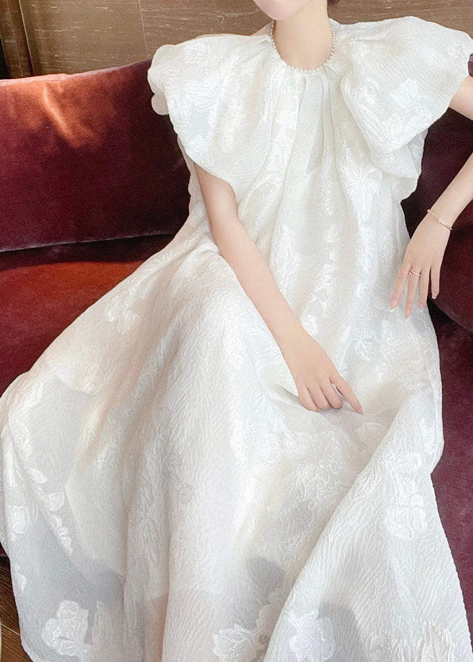 Jacquard White O-Neck Silk Long Dresses Short Sleeve