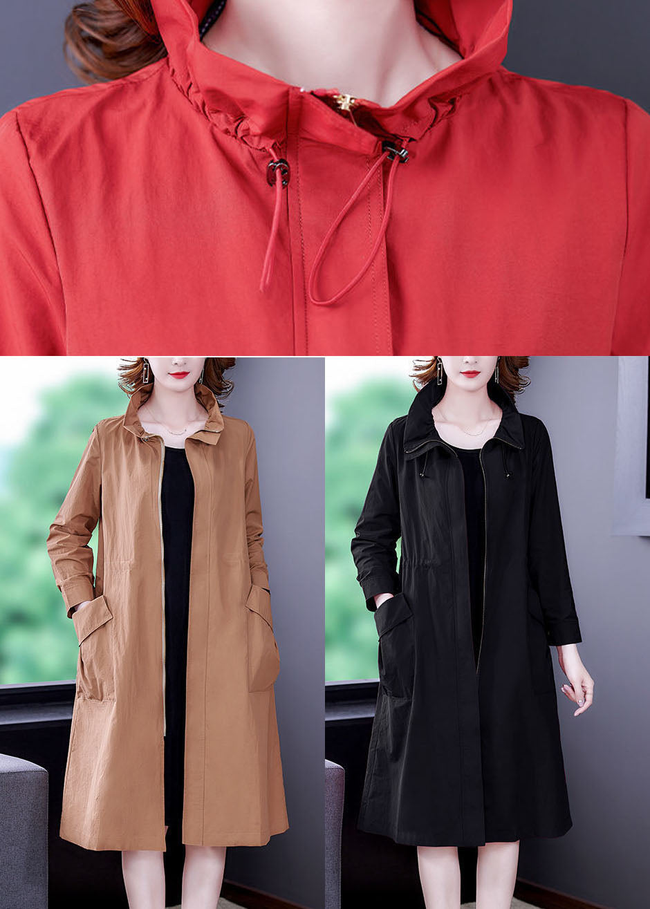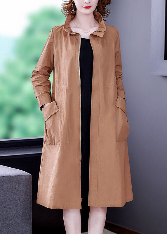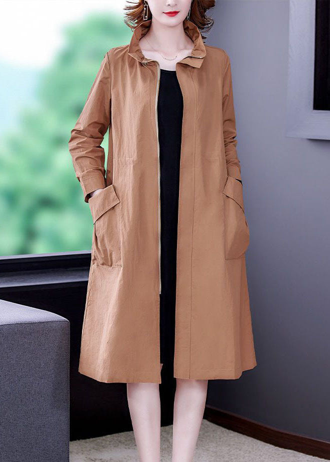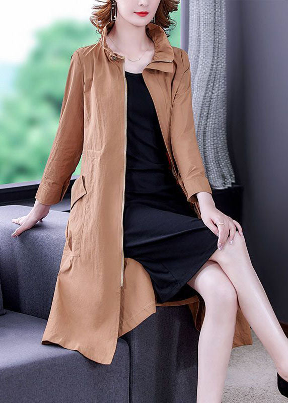 Khaki Solid Silk Trench Drawstring Zippered Long Sleeve