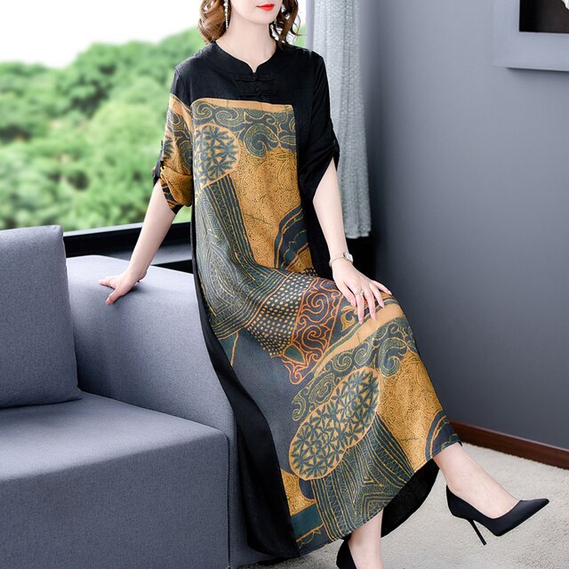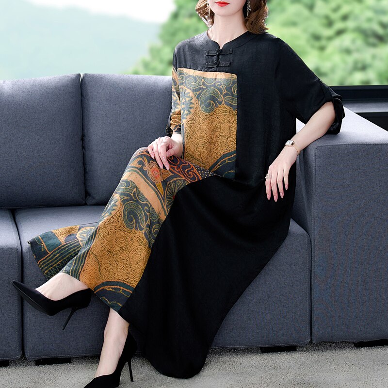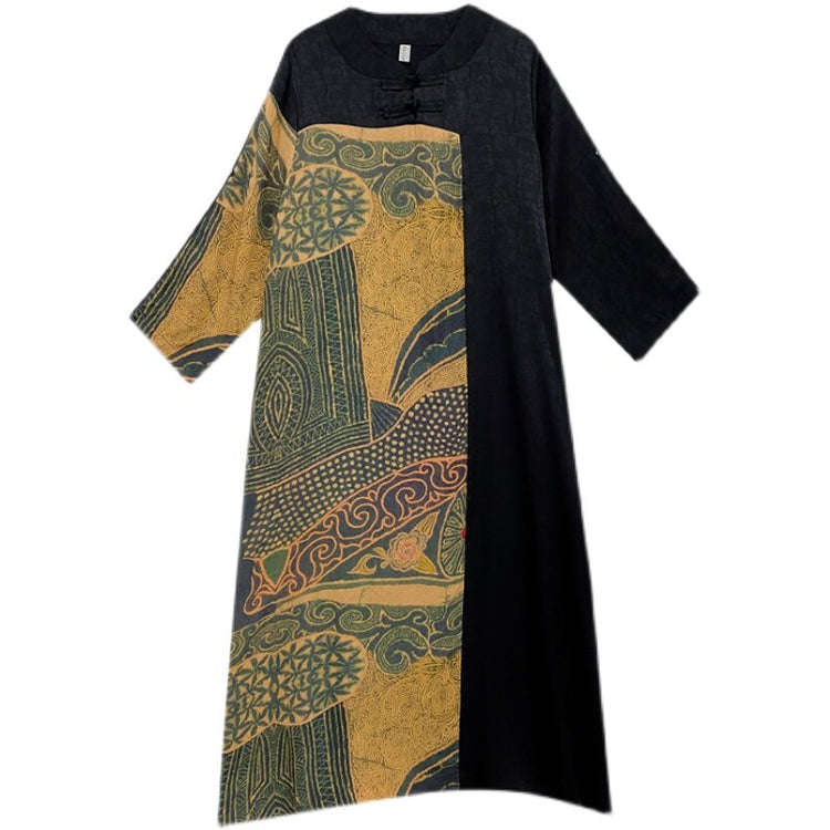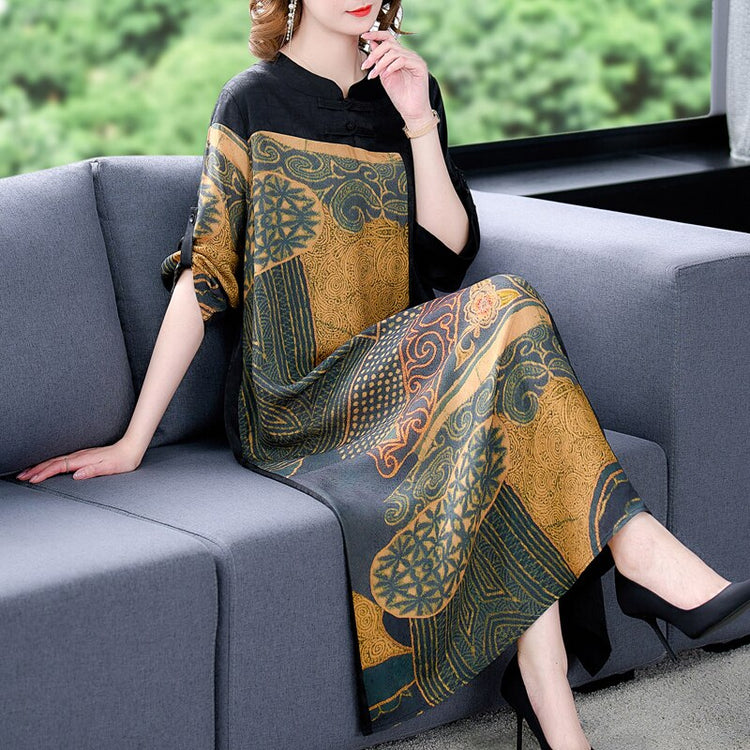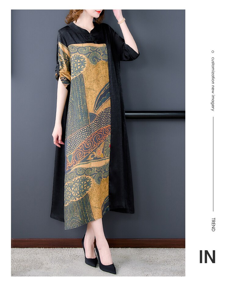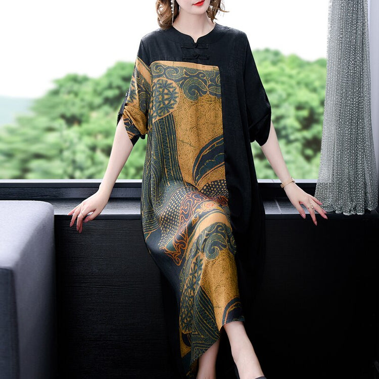 Loose Black Patchwork Print Natural Silk Midi Dress