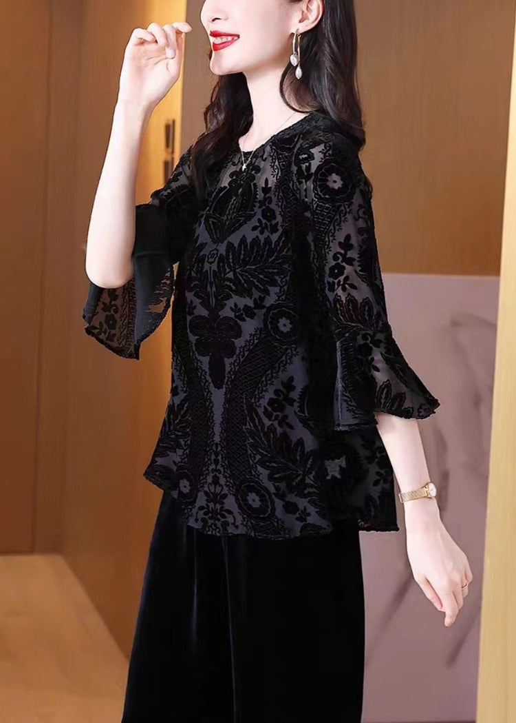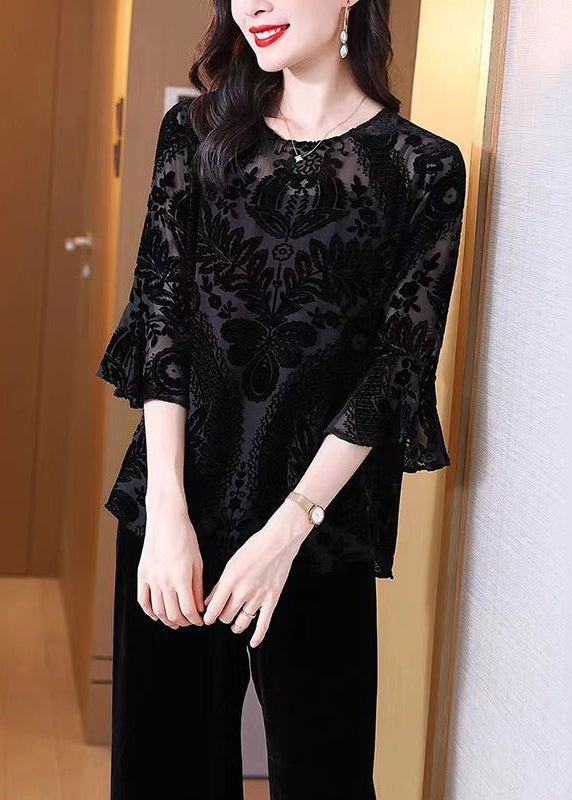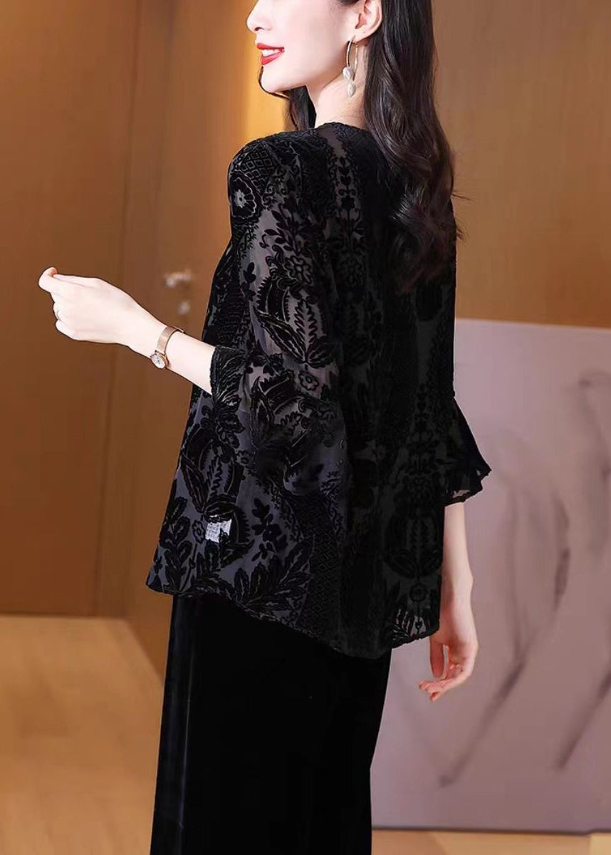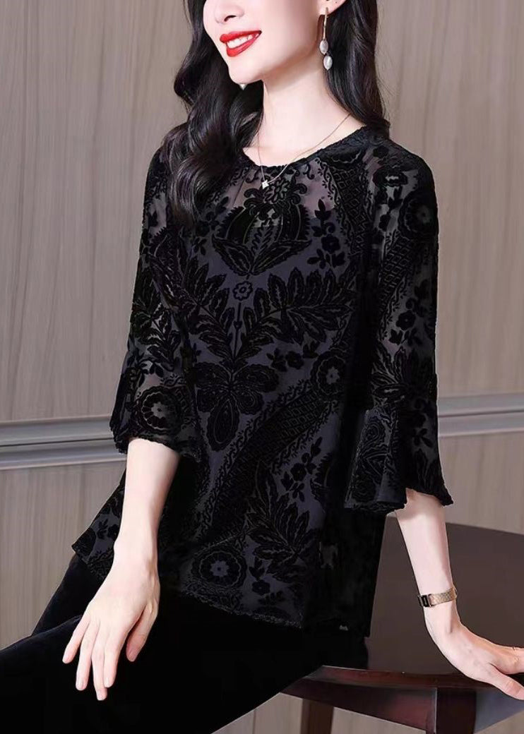 Loose Black O Neck Embroideried Patchwork Silk Velour Lantern Sleeve