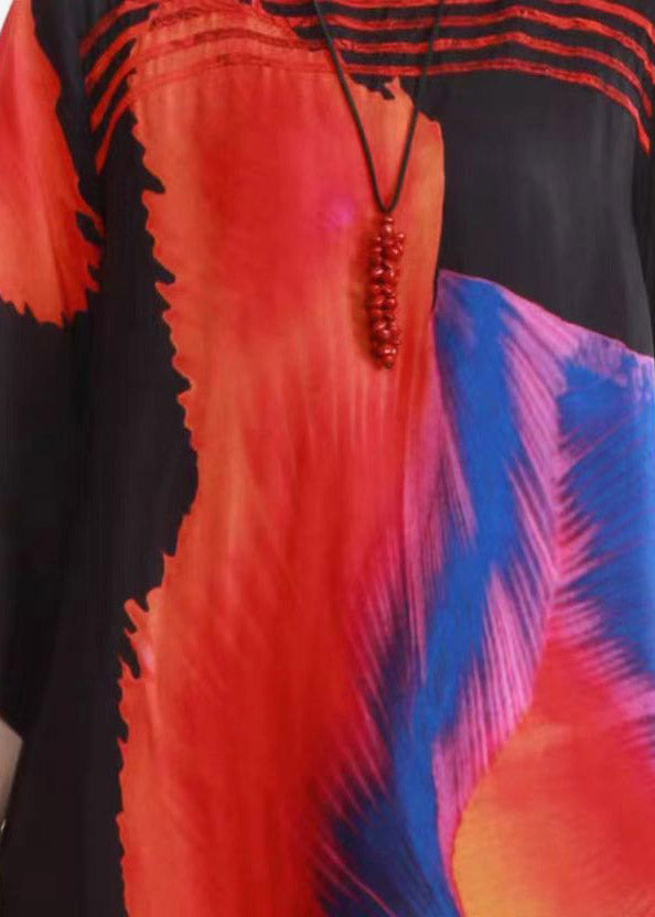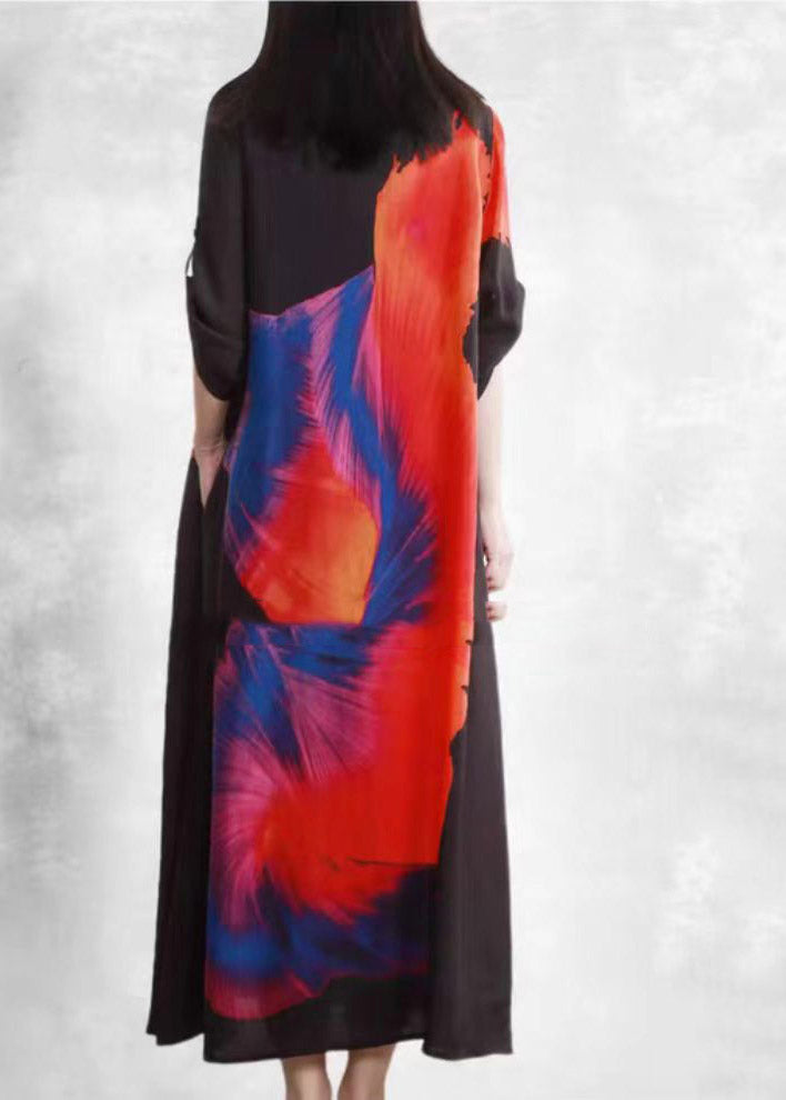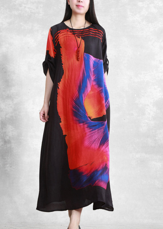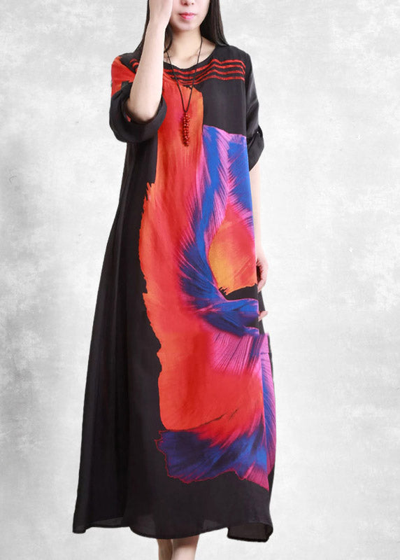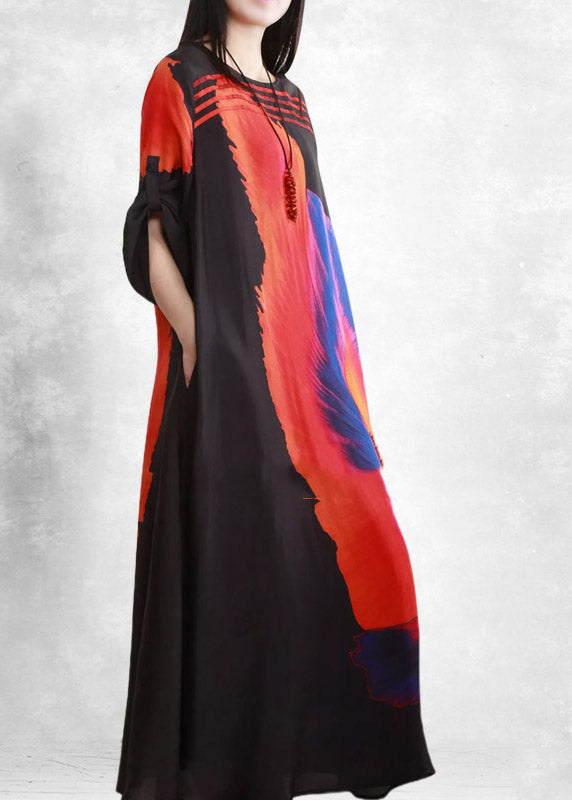 Loose Black O-Neck Print Pockets Silk Dress Half Sleeve