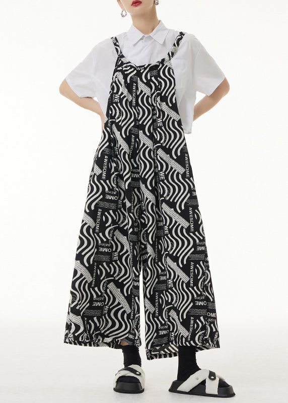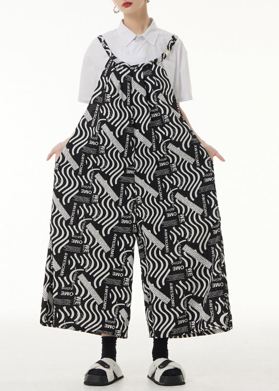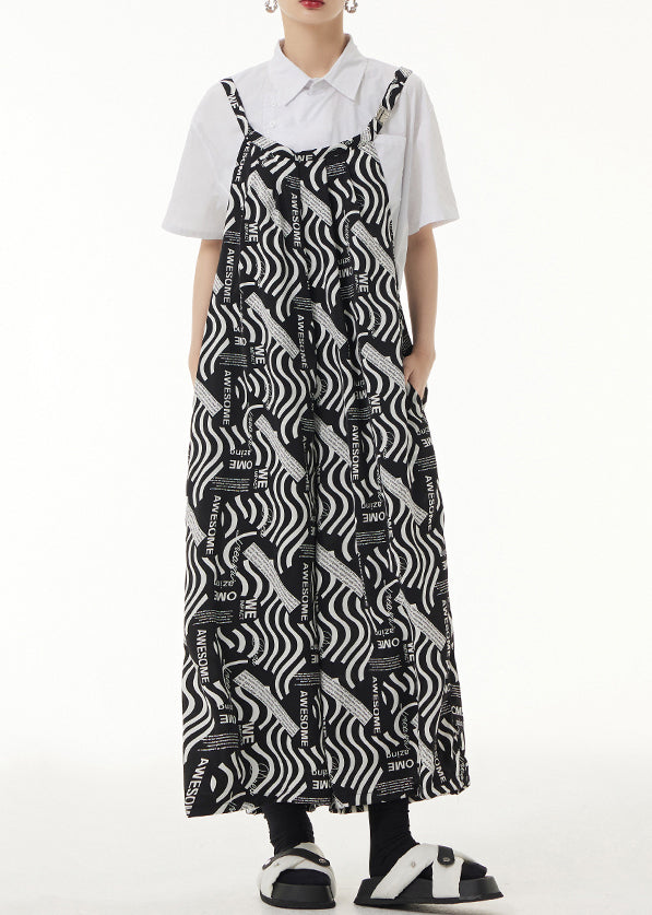 Loose Black Print Pockets Patchwork Silk Cotton Jumpsuits Sleeveless