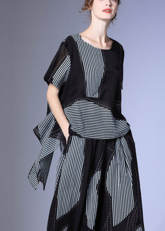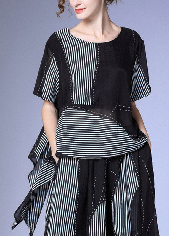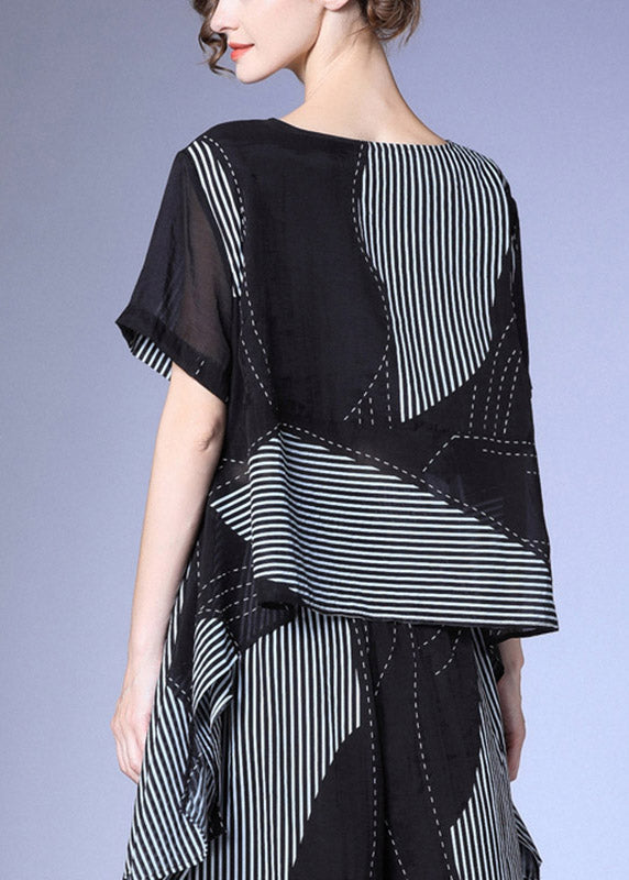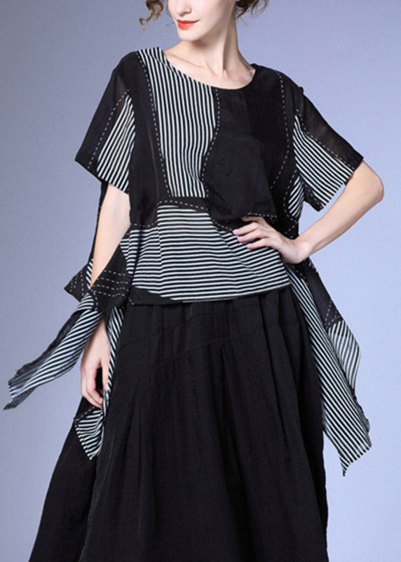 Loose Black Striped Patchwork Silk Tops Short Sleeve