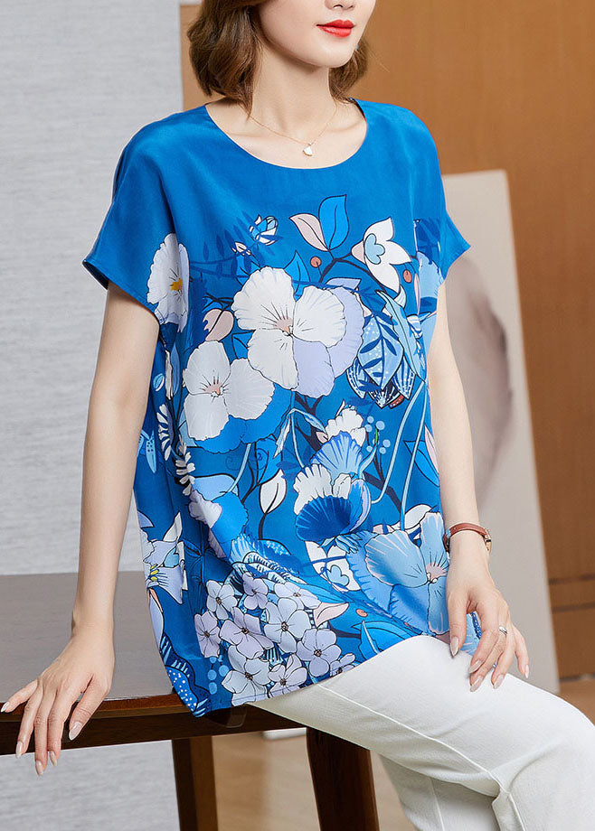 Loose Blue O-Neck Original Design Print Silk Tank Short Sleeve