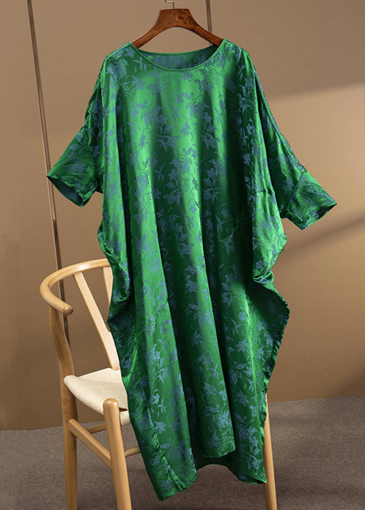Loose Green O Neck Jacquard Patchwork Silk Dress Half Sleeve