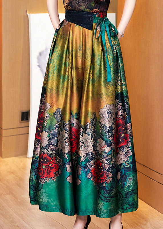 Loose Green Tie Waist Tunic Pockets Floral Print Silk Wide Leg Pants Summer